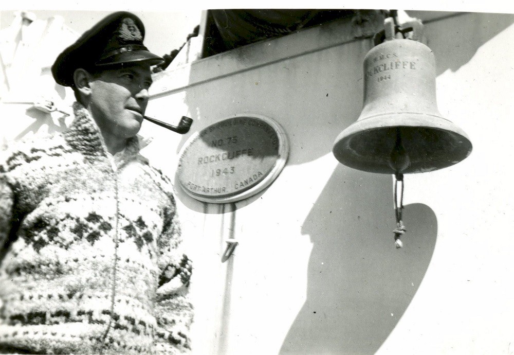 Surgeon-Lieutenant John Nelson Boright Reilly, RCNVR by the ship's bell on HMCS ROCKCLIFFE J355 - circa 1945