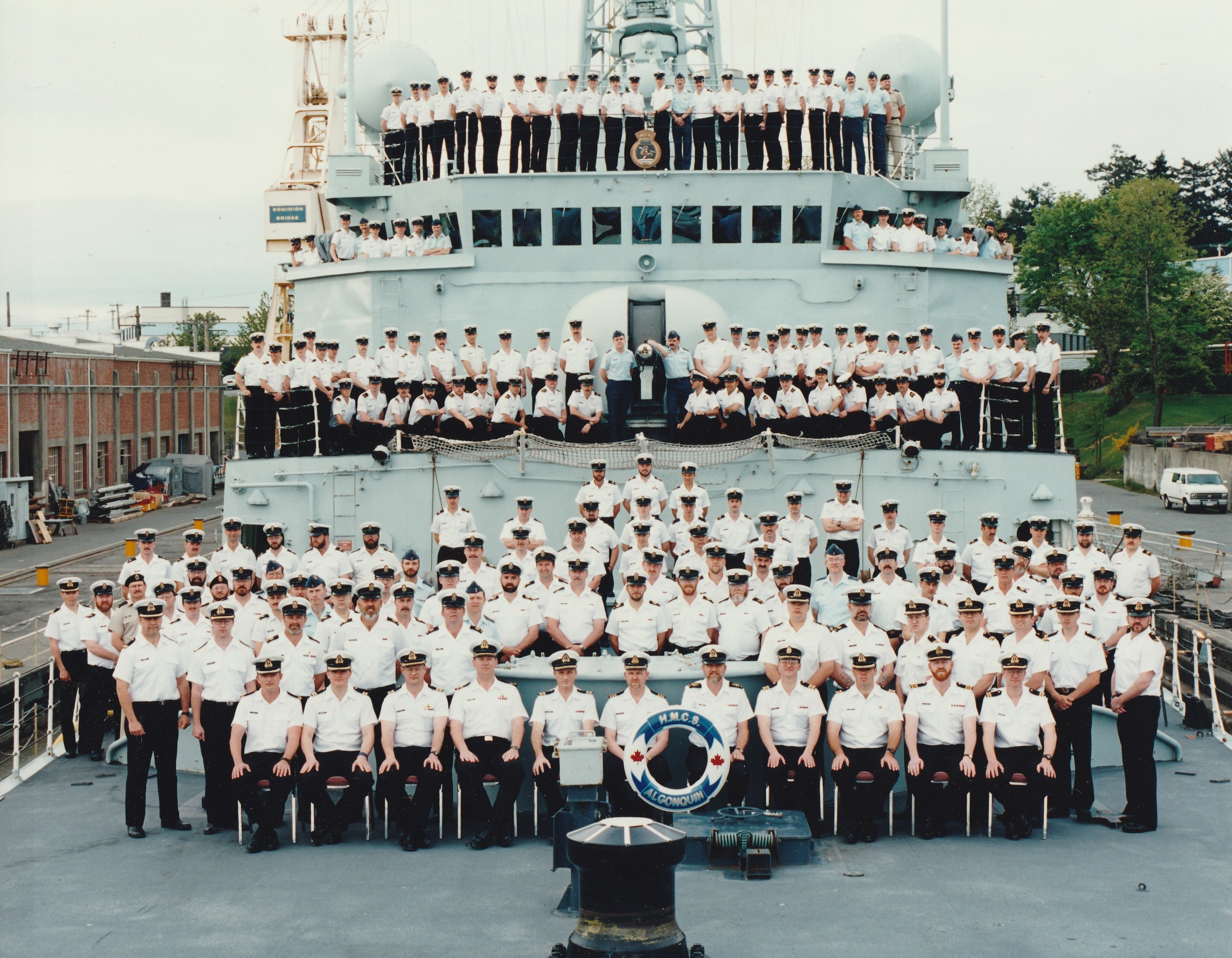 HMCS ALGONQUIN 283 in dry dock at HMC Dockyard Esquimalt - 1995 Click on the above photo to view a larger image Click here to view the photo with crew numbered for identification purposes Courtesy of John Martin