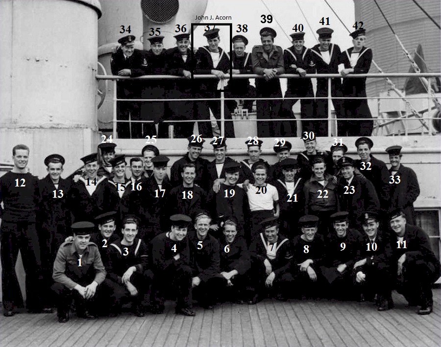 (7) Webster, Gerald (Gerry) (24) Cummins, Ralph, L/Sto, RCNVR (33) Henrickson, Wilfred (37) Acorn, John James (38) Connolly, William E. (39) Sulkers, Herman, AB (41) Sutherland, William Grant, Stoker (42) King, John From the collection of John James Acorn Courtesy of Barry Acorn