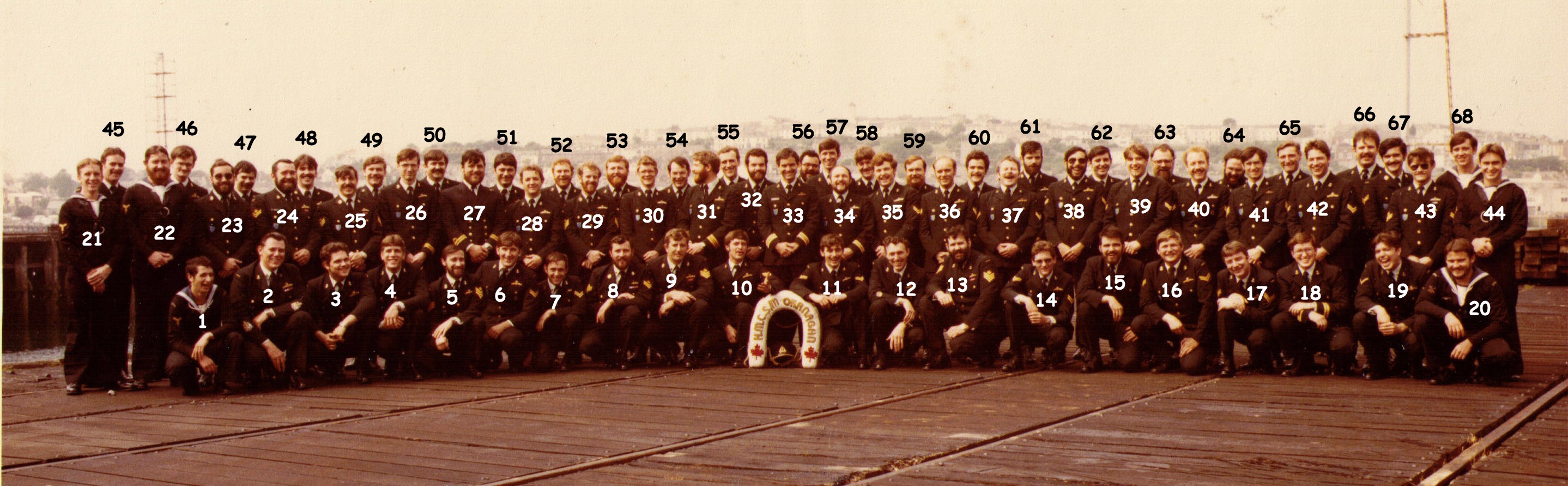 (1) Paul Brennen, RAN (2) George Sullivan (3) Steve McLellan (4) Marty Dussault (5) Len Beck (6) Darrell Kays (7) John Stone (8) Dave Stobie (9) Al Pindera (10) Mark Baine (11) Ron Miles (12) Ken Irving (13) Bob Bramwell (14) Dean Hiscock (15) Richard LaForest (16) Peter Bowen (17) Ron Butchart (18) Greg Cottingham (19) Rick Whalan (20) Gabe Vincent, RAN (21) Peter Cater, RAN (22) Craig King, RAN (23) Unknown (24) Dwight Campbell (25) Claude Gendron (26) Alfred Smith (27) Chris Reynolds (RN) (28) Unknown (29) Dane Brousseau (30) Barry Bucher (31) Graham Day (XO) (32) Les Mosher (33) Bruce MacLean (CO) (34) Charles Heirons (35) Cyril MacDonald (36) Paul Legare (37) Roger McCabe (38) Jesse Pring (39) John Hughes (40) Nigel Walsworth (41) Jim Reid (42) Tony Palmer (43) Bill Bimm (44) Dakers, RAN (45) Brian McBarron (46) Jim Northrup (47) Brian Kenty (48) Joe Keast (49) Dan Reid (50) Garry Gillespie (51) Gord Hamilton (52) Mike Cousineau (53) JJ Walsh (54) Cliff Gariepy (55) Jim Brannen (56) Don Hogg (57) Carl Hallet (58) Rob Bray (59) Dave Dupont (60) Joe Laprade (61) Marc Pallard (62) Denis Chitouras (63) Gilles Poirier (64) Unknown (65) Bruce Pelley (66) Al Casey (67) Jamie Jamison (68) Craig Dumesney, RAN