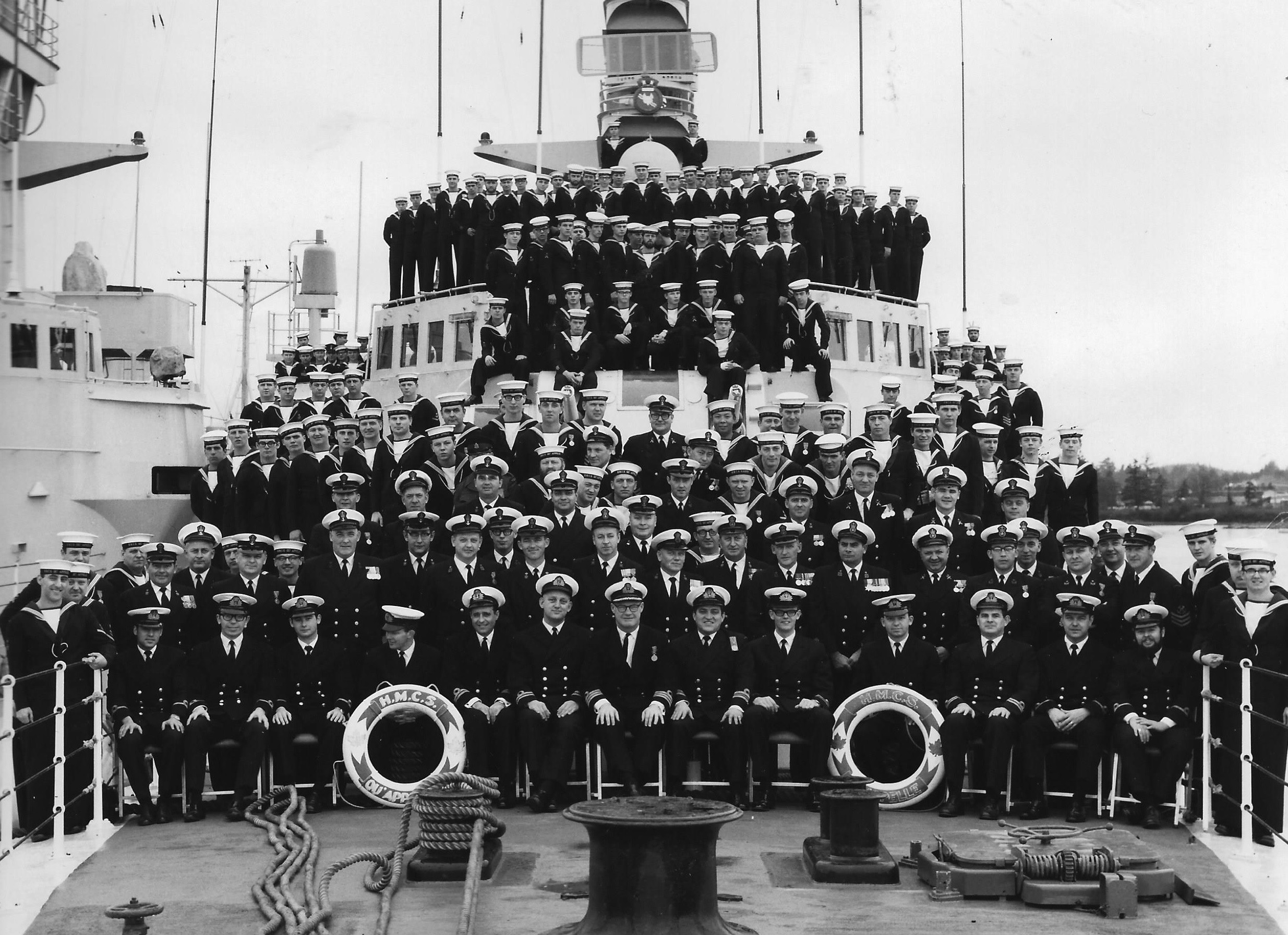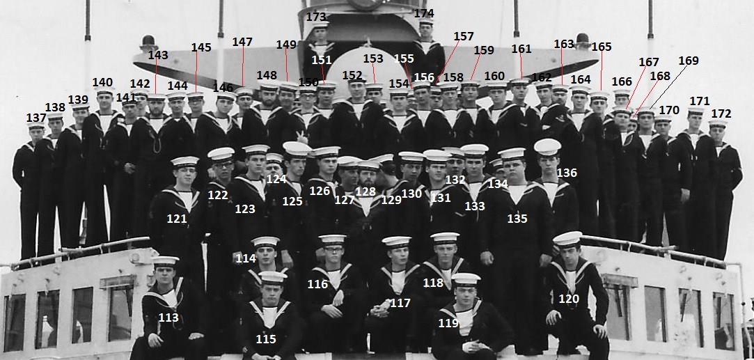 (5) Kilner, John, Lt, Weapons O (7) Allen, John (Jock), Cdr, CO (8) Godbout, LCdr, XO (15) Identified as Hill, P2RP or Allcock, Ron, LSWS (18) Jenkins, P1BN (20) Schauer, P2ER (22) Sparrow, Ken, P2ER (23) Hargraves, P1SM (24) Pfister, P1ER (25) Campbell, Hope, P1SN (26) Reitsma, P2SG (27) Perissini, Lou, C2ER (28) Hooper, C1RP (30) Gustavson, C1ER (31) Grass, LS.HT (32) Shaw, C2BN (33) Davidson, C2LT (34) Sprauge, C2SN (35) Hoffman, P1WU (38) Baltimore, P1RM (40) Rosenfeld, P1RM (42) Gjesdal, ABSN (43) Biccum, ABRP (44) Webb, Edward Frank (Ted), P1ER (46) Lister, P1ER (47) Cross, P2WS (50) Topping, P2BN (52) Nicol, LSSN (53) Presley, P1ER (54) Sears, P1WS (55) Young, P1FC (56) Rayment, P1SG (58) Jankowski, ABSN (61) Hamilton, ABSN (62) McCabe, ABBN (66) Mayo, P2NS (67) P1RP Kobyashi (70) Dykstra, LSSN (79) Pearson, P2.SN (80) Boomer, P1FC (81) Chan, P2HT (84) Fransden, Bob, LSBN (89) Brown, LSSN (90) Hleuka, LSWS (103) Menzies, ABWU (114) Lumley, ABWS (129) Martel, Raynald, SN (140) Hlasny, P2LT (141) Irvine, P2BN (144) Logan, LSRP (147) Kelly, LSRP (150) Reeves, ABRM (151) Gibbon, ABRM (152) Carpenter, ABSN (165) Storey, ABSN