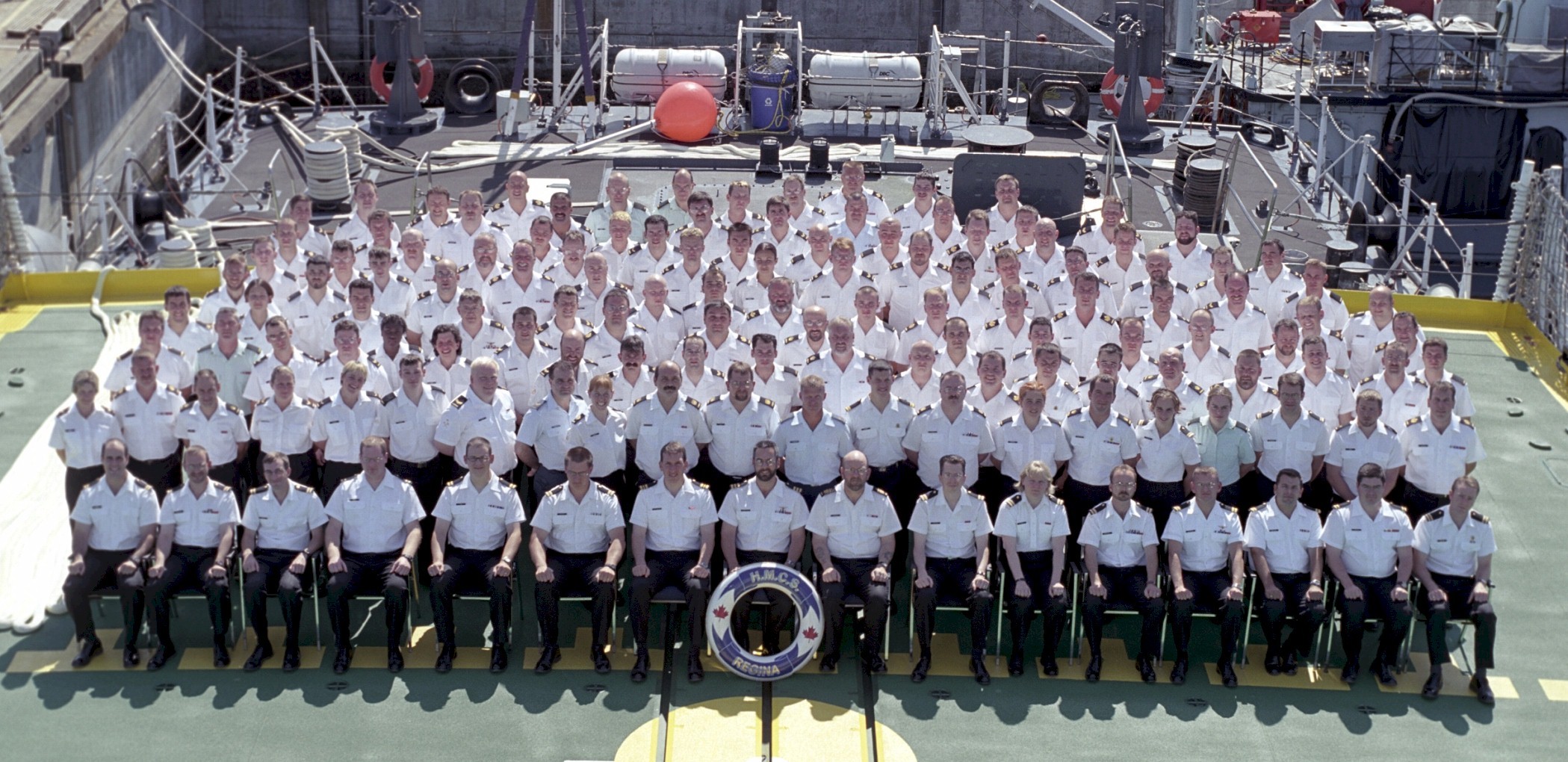 HMCS REGINA 334 circa 2002 Click on the above photo to view a larger image without numbers (1) Harwood, Jay (2) Heffernan, John (4) Mazur, David (5) Payne, Brian (7) St. Denis, Patrick, LCdr, XO (8), Truelove, William, Cdr, CO (9) Forsyth, Brian, CPO1, Cox'n (10) Maranda, Gilles, MSEO (11) Kincaid, Katherine, LogO (15) Summers, Ted, CSEO (27) Lake, Brian (Benny), CBM (30) Cyr, Kevin, CSE Chief (32) Vincelette, Michel (55) Lowther, David (66) Drodge, Ian (74) Joiner, Barry (100) MacLean, John, CERA From the collection Brian Forsyth Courtesy of Brian Forsyth