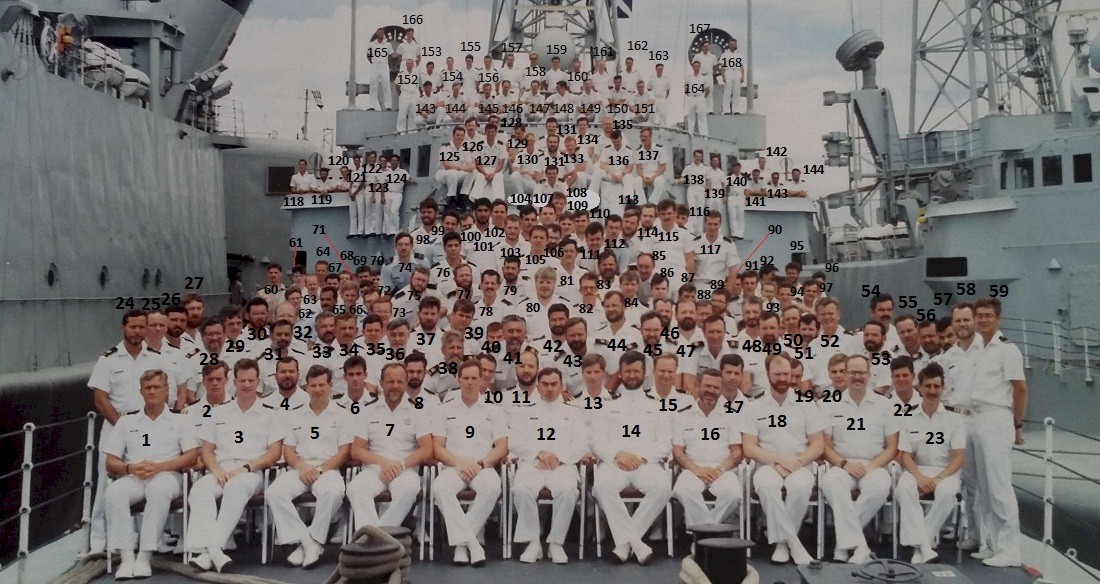 (1) PO2 Sutherland (2) AB B. Stuart (5) MS L. Gjesdale (6) PO2 Flack (7) LS B. Bouvet (9) PO R. Falk (10) SGT W. Bradshaw (11) AB D. Shipalesky (12) AB R Johnston (13) PO D. McCoy (14) MS E. Davis (15) LS Zimmer (17) LS J. Osbourne (18) PO2 Griffiths (20) Lt Stewart (21) PO E. Lee (22) PO2 Parker (23) PO W. Harkness (24) MS Gale (25) MS G Johnston (28) PO P. Hill (29) MS Brown (30) PO M. Wierenga (31) PO R. Dallin (33) AB Flavelle (34) LS Taylor (36) LS P. Peachey (39) PO2 Francis (40) LCdr Foldesi