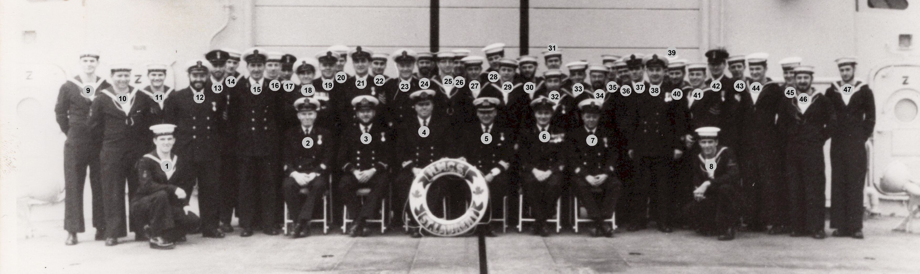 (9) Yorgensen, Lt, Engineering Officer (11) Tomlinson, Gordon, Chief Petty Officer 1st Class Marine Engineer, CERA (14) Dudley, Chief Petty Officer 2nd Class Marine Engineer (34) Curtis, Ken (Festus), Chief Petty Officer 2nd Class Marine Engineer (39) Smith, Chief Petty Officer 2nd Class Marine Engineer (71) Blake, Harry, Leading Seaman Marine Engineer (100) Cockran, Able Seaman Electrical Techncian (103) Henderson, Dave (Henny), Able Seaman Marine Engineer (113) Page, Gord, Able Seaman Marine Engineer (115) has been identified as either Flieger, Kenneth or Kleinsmith, Art, Able Seaman Electrical Technician (118) Sweeney, Jim, Leading Seaman Marine Engineer (122) Sauer, Herb (127) Beadoin, Lloyd, Able Seaman Marine Engineer (146) Nickerson, Leading Seaman Marine Engineer Courtesy for Gord Page