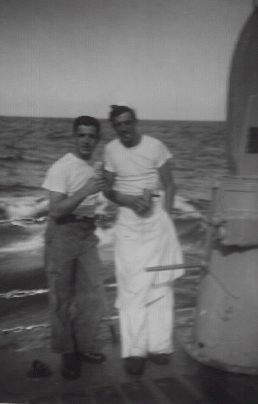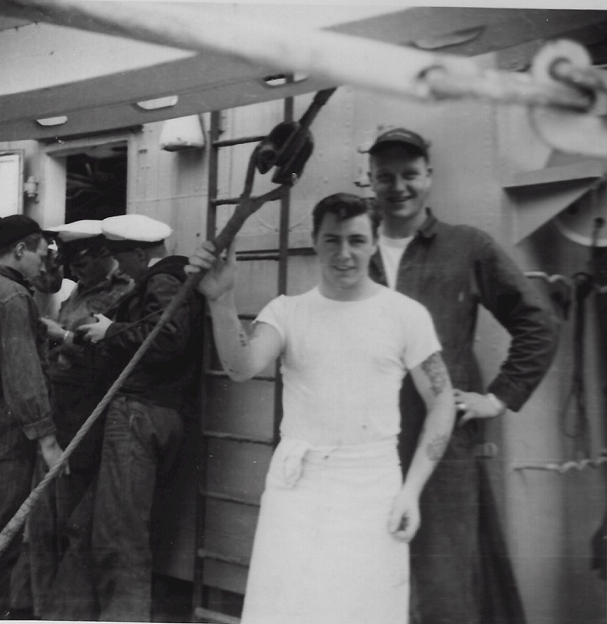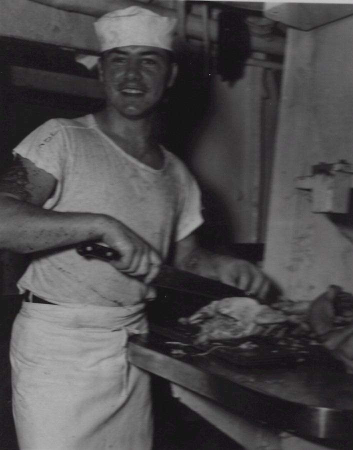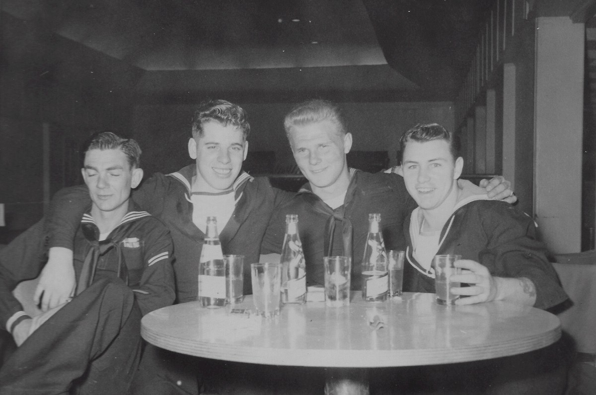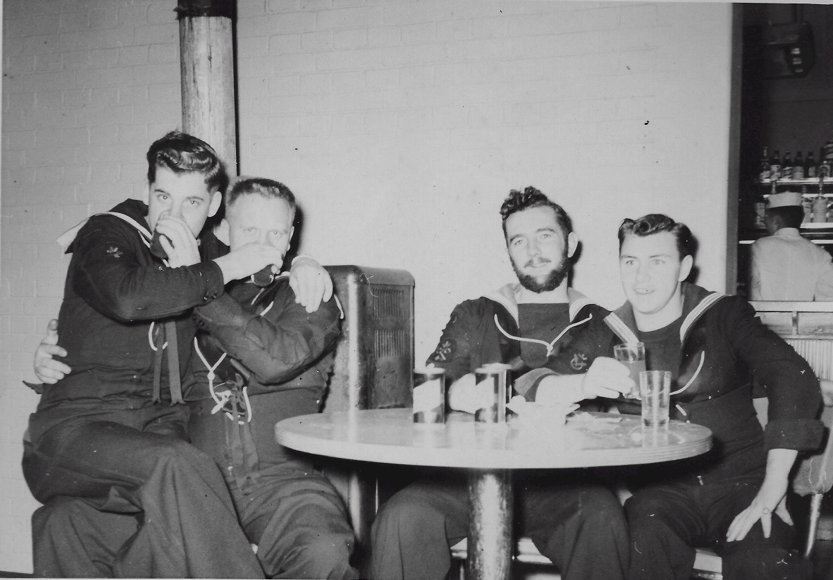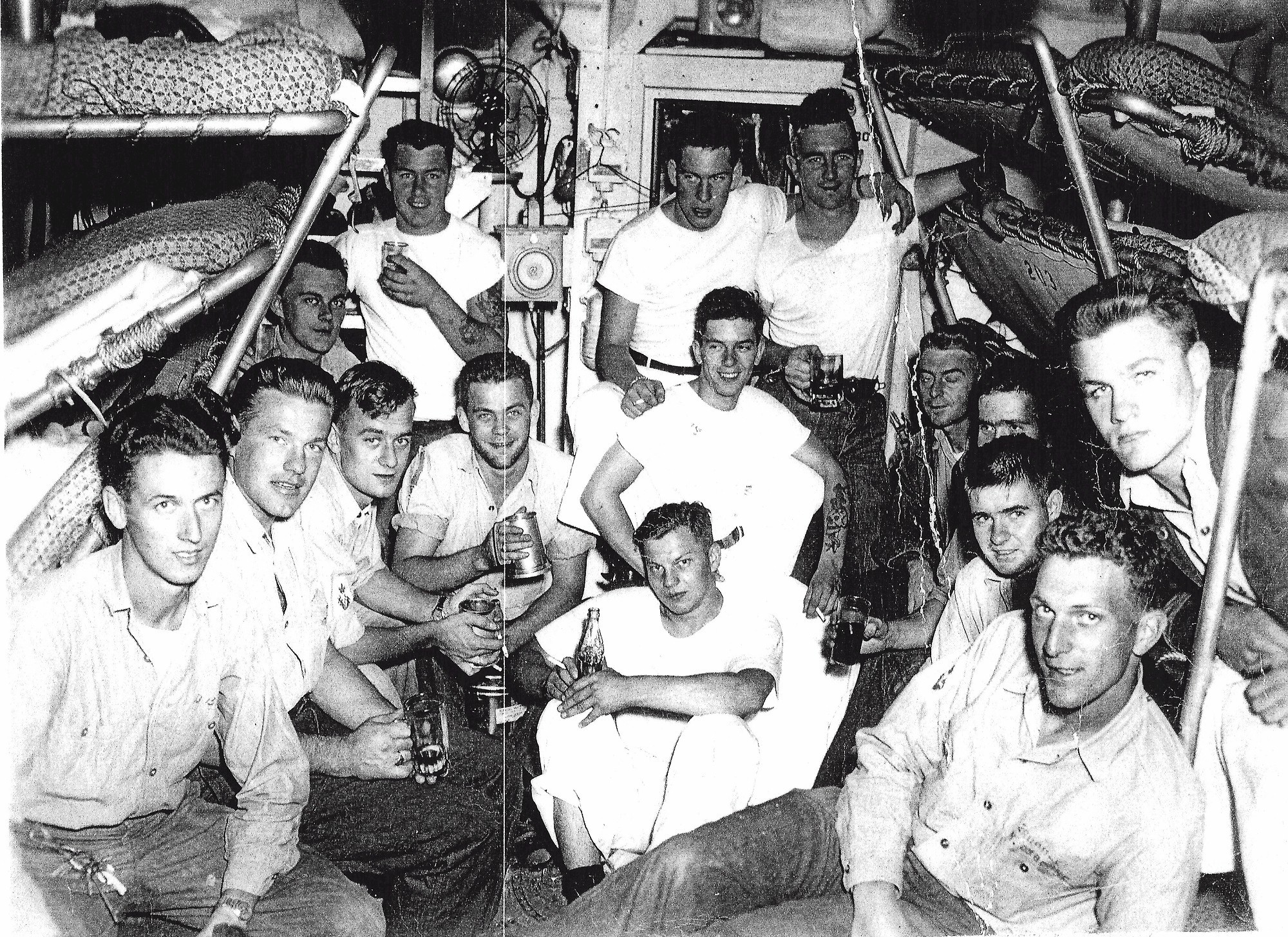 (JCT013) Sailors off HMCS SIOUX 225, Beer Gardens, Pearl Harbor, HI - 1954 (JCT014) Sailors off HMCS SIOUX 225, Beer Gardens, Pearl Harbor, HI - 1954 (JCT015 - JCT016) ABCK Joe Tanner in the galley on HMCS SIOUX 225 - 1954 (JCT017) HMCS SIOUX 225, Korea, 1954 - Forward Lower Mess Deck // Borque, Burk, Fast, Calder, Tanner, Tessier, Gerning, Gunther, Bernie, Taff Thomson, Cole, unknown, Bartrom, Ozzbern, Bill Guy // Click here to view the photo with crew numbered