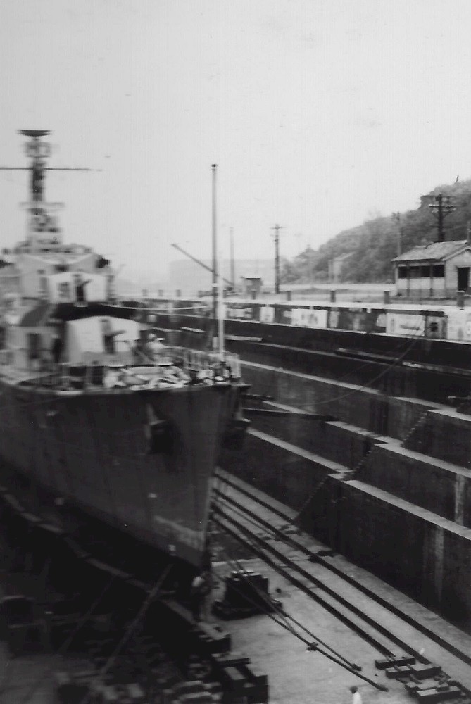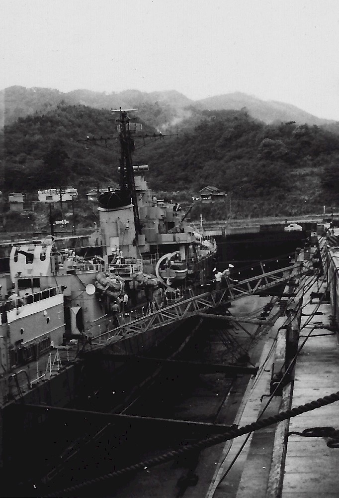 (JCT029 - JCT031) HMCS SIOUX 225 in dry dock at Sasebo, Japan, for repairs - 1955
