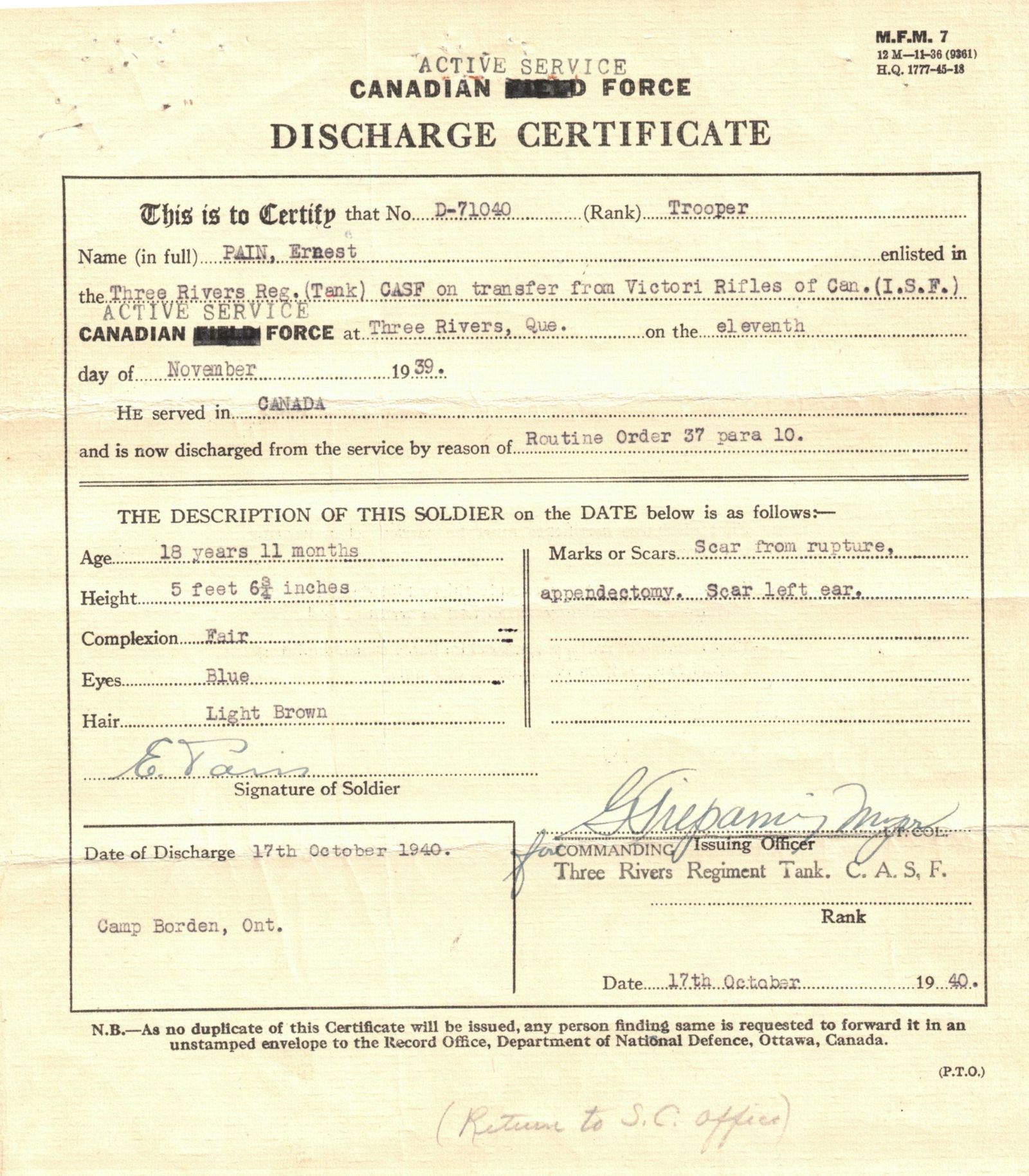 Prior to joining the Navy, Ernest served in the Victoria Rifles of Canada and the Three Rivers Reg. (Tank). He was on Active Service from 11 Nov 1939 till his Discharge from the Army on 17 Oct 1940