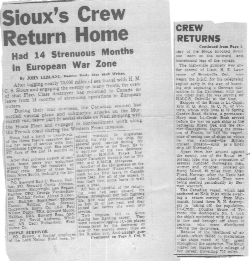 Article on HMCS SIOUX's return to Canada in Apr 1945 Click on the above photo to view a larger image