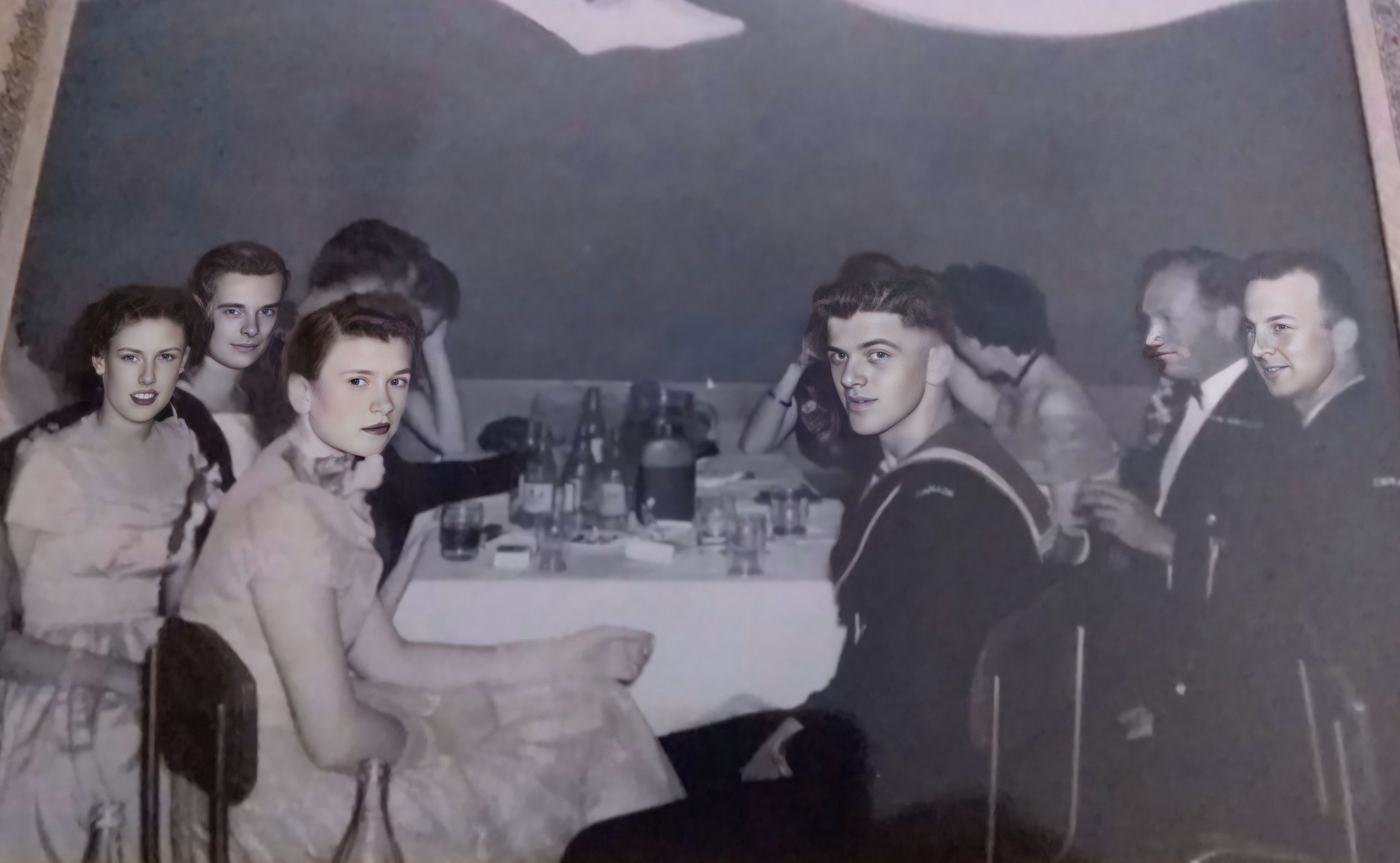 (RMS003) Able Seaman Robert Schroth (front right) across from his date at a ship's company function.