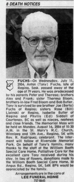 FUCHS, Anton (Tony) - On Wednesday, July 11, 2004, Anton (Tony) Fuchs, late of Regina, Sask. passed away at the age of 79 years. He was predeceased by his parents Peter (1896-1968) and Theresa (née Folk / Volk) (1899-1982) Fuchs; brothers Alex and Frank; sister Theresa Bloom, brothers-in-law Fred Bloom and Bob butler. Tony is survived by one brother Joe (Berta) Fuchs of Regina; sisters Rose (Bill) Lipinski of Regina, Isabelle Butler of Regina and Phyllis (Ed) Siddall of Courtenay, BC as well as nieces, nephews and close friends. The Memorial Mass will be held on Monday, August 16, 2004 at 10:30 A.M. in the St. Mary's R.C. Church, Winnipeg and 13th Ave., Regina, SK with Rev. R. Rodriguez, celebrant. The interment will follow at Riverside Memorial Park. On behalf of Tony's family, many thanks to the staff at the William Booth Special Care Home, Palliative Care for the excellent care Tony received during his stay. In lieu of flowers, donations made to the William Booth Special Care Home, 50 Angus Rd., Regina, SK, S4R 8P6 would be appreciated by the family. Arrangements are in the care of Lee Funeral Home. (Click here to view the obituary as published)