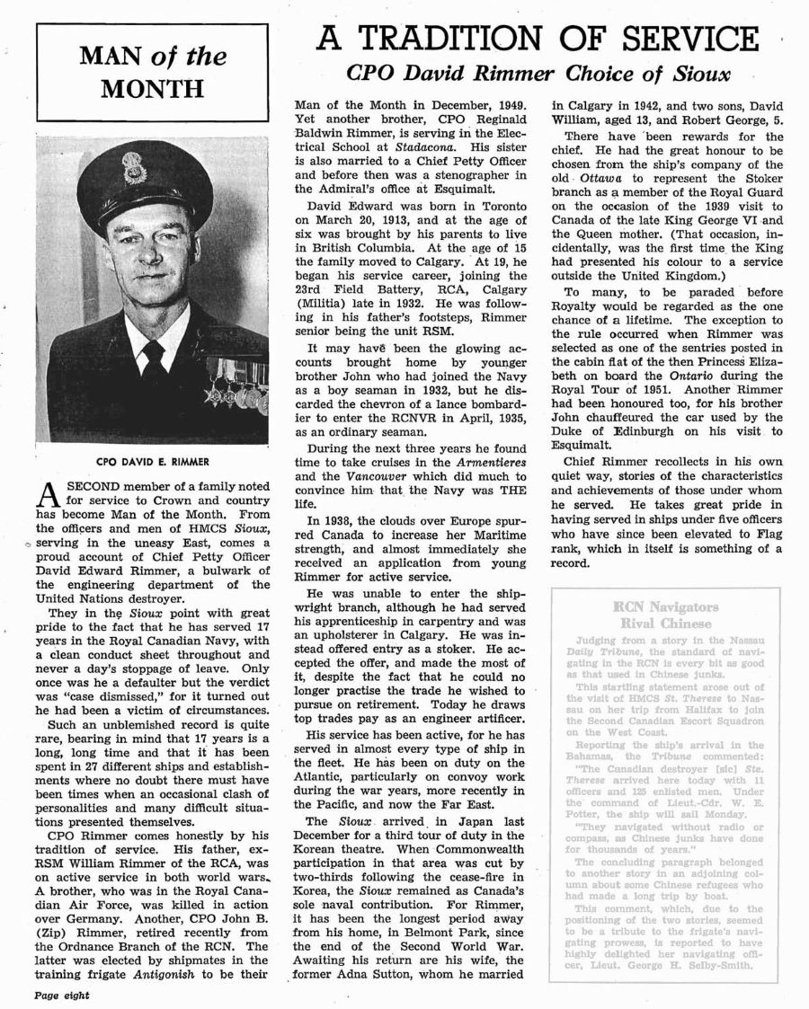 CPO David Edward Rimmer Man of the Month Crowsnest Magazine - Sep 1955