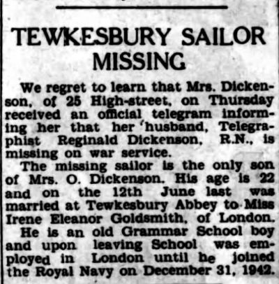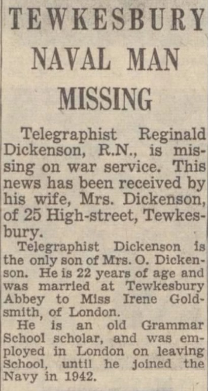 Telegraphist Dickenson died when his ship, HMCS VALLEYFIELD, was torpedoed and sunk on 07 May 1944 by U-548. Of her crew of 163, there were only 38 survivors.