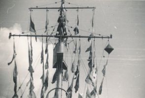 (GAH006) George Huxley on the yardarm directly above the Crow's nest on HMCS STRATHROY K455