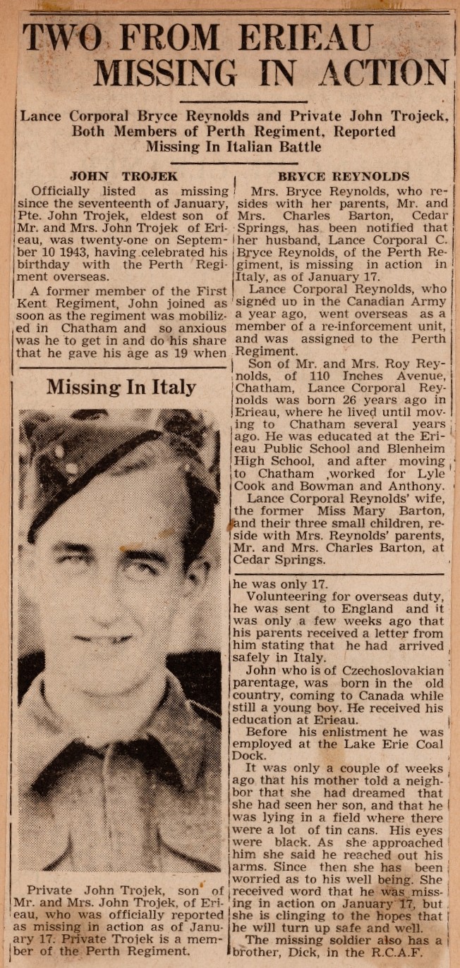 (JNC002) Wedding Announcement for James Thompson and Mary Lolly (JNC003 10 Windsor District Lads Called for Coastal School Training (JNC004) Erieau, Ontario Claims Service Record (JNC005) Two From Erieau Missing in Action