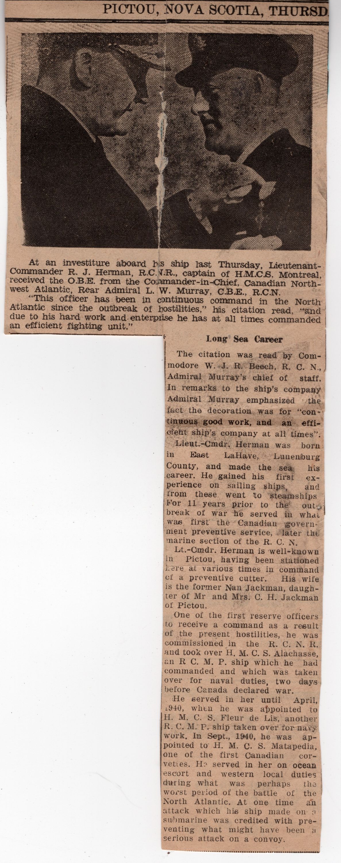 Ships served in: WINDSOR DIVISION RCNVR - Enlisted 11 Nov 1940 * Commenced Active Service 11 Nov 1940 as a Stoker 2nd Class, RCNVR HMCS STADACONA - Drafted to STADACONA 03 Dec 1940 HMCS HAMILTON - Drafted to HAMILTON 04 Jun 1941 * Rated Stoker 1st Class, RCNVR 03 Oct 1941 HMCS STADACONA - Drafted to STADACONA 09 Jul 1943 HMCS HAMILTON - Drafted to HAMILTON 09 Aug 1943 * Rated Acting Leading Stoker, RCNVR 15 Sep 1943 HMCS STADACONA - Drafted to STADACONA 01 Jun 1944 HMCS PEREGRINE - Drafted to PEREGRINE 20 Nov 1944 HMCS BITTERSWEET - Drafted to BITTERSWEET 24 Nov 1944 * Rated Acting Stoker Petty Officer, RCNVR 01 Oct 1944 HMCS NIOBE - Drafted to NIOBE 19 Jun 1945 HMCS PEREGRINE - Drafted to PEREGRINE 25 Jun 1945 HMCS HUNTER - Drafted to HUNTER 07 Jul 1945 * Demobilized 07 Aug 1945