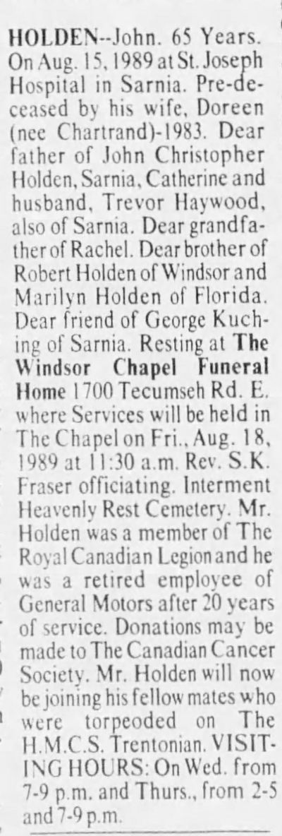 HOLDEN, John - 65 years. On Aug. 15, 1989 at St. Joseph Hospital in Sarnia. Pre-deceased by his wife, Doreen (née Chartrand) - 1983. Dear father of John Christopher Holden, Sarnia, Catherine and husband, Trevor Haywood, also of Sarnia. Dear grandfather of Rachel. Dear brother of Robert Holden of Windsor and Marilyn Holden of Florida. Dear friend of George Kuching of Sarnia. Resting at The Windsor Chapel Funeral Home 1700 Tecumseh Rd. E. where Services will be held in The Chapel on Fri., Aug. 18, 1989 at 11:30 a.m. Rev. S. K. Fraser officiating. Interment Heavenly Rest Cemetery. Mr. Holden was a member of the Royal Canadian Legion and he was a retired employee of General Motors after 20 years of service. Donations my be made to The Canadian Cancer Society. Mr. Holden will now be joining his fellow mates who were torpedoed on H.M.C.S. Trentonian. Visiting hours: On Wed. from 709 p.m. and Thurs., from 2-5 and 7-9 p.m. (The Windsor Star 17 Aug 1989) Click here to view the obituary as published