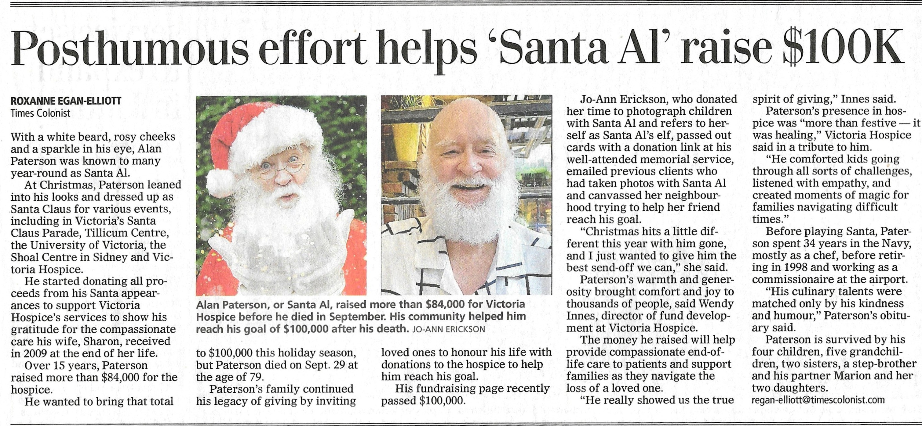 PATERSON, Alan William - passed away peacefully on September 29, 2025, with family and friends by his side. Al lived life to the fullest as a brother, husband, father, uncle, grandfather, Chief Petty Officer 1st Class, and Santa.