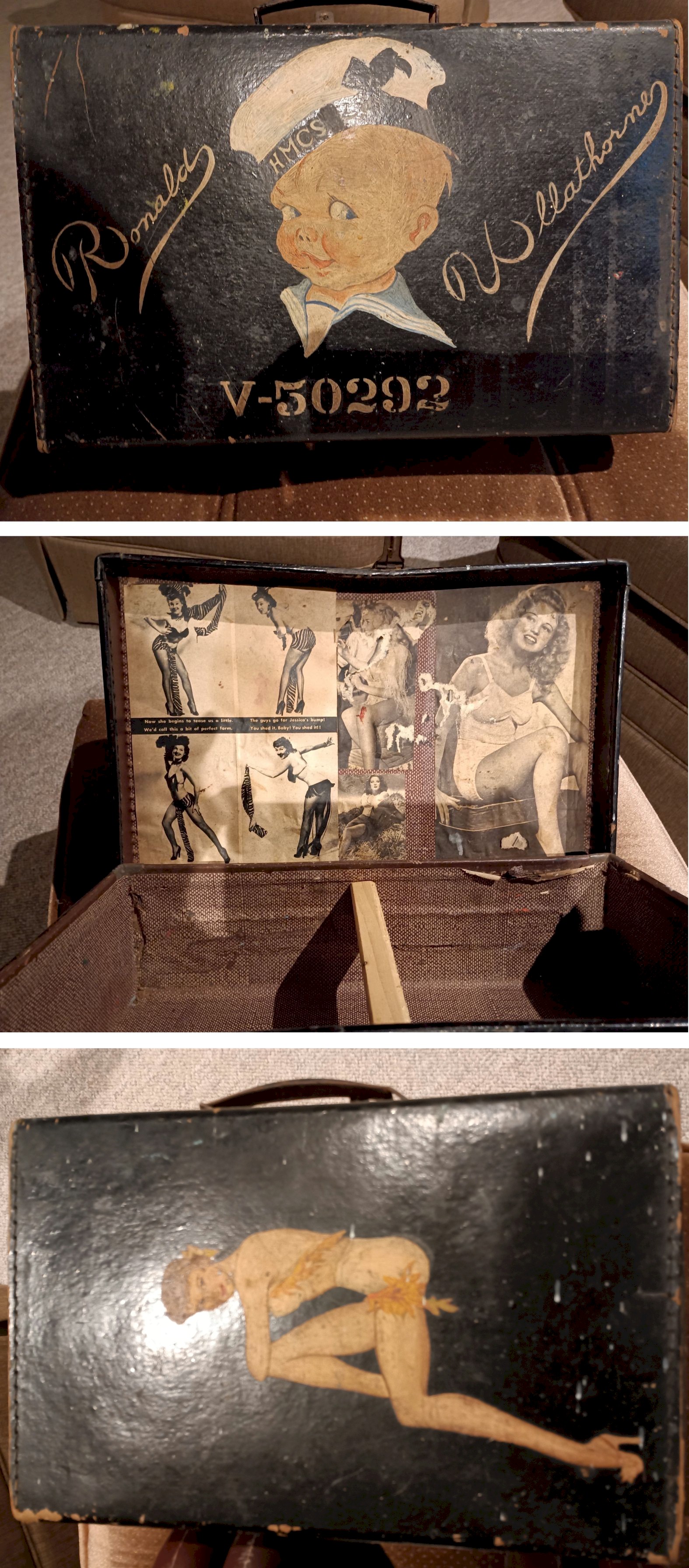 (RRU001) Gunshield art painted by Ronald Ullathorne on the gun shield of the pom-pom in the after gun tub on HMCS SUMMERSIDE K141 (RRU002) Ron's service attaché case. This was used when sailors went on leave to carry the necessities - socks, underwater, shaving kit, letter writing kit, etc. Sailors travelled light on leave as they had to wear their uniforms. It was not uncommon for sailors to personalize they attaché case. Courtesy of Dianne Jones