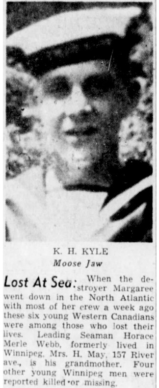 KYLE, Kenneth Harvey, AB LR III, 3182, RCN, MPK - 22 Oct 1940, HMCS MARGAREE - Son of John E. and Winnifred Kyle, of Moose Jaw, Saskatchewan.