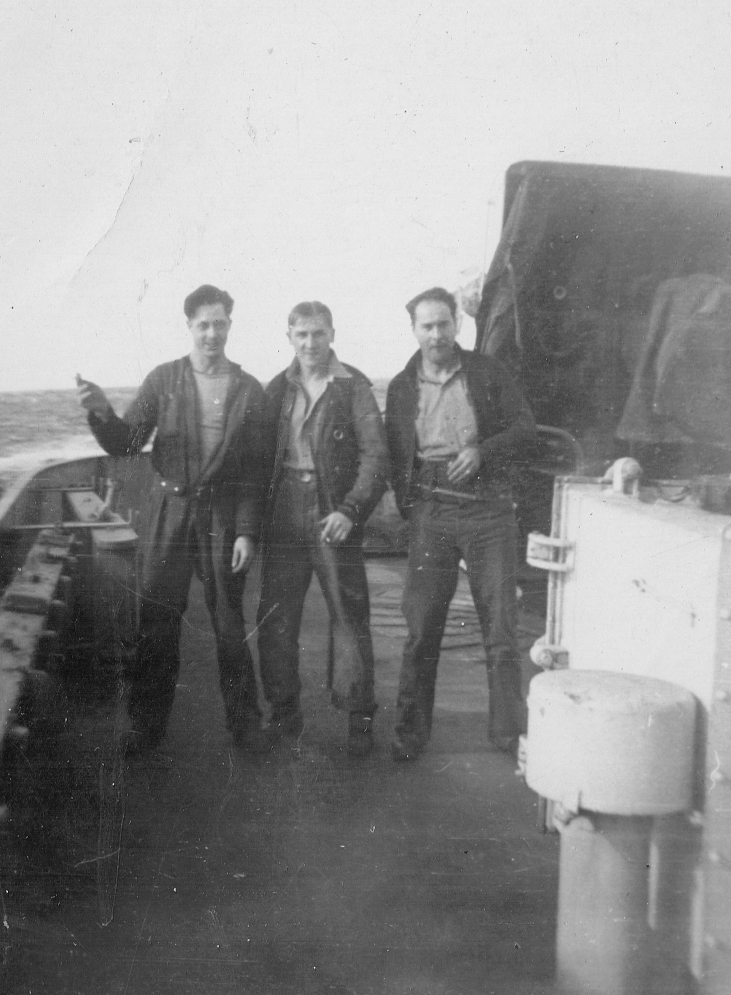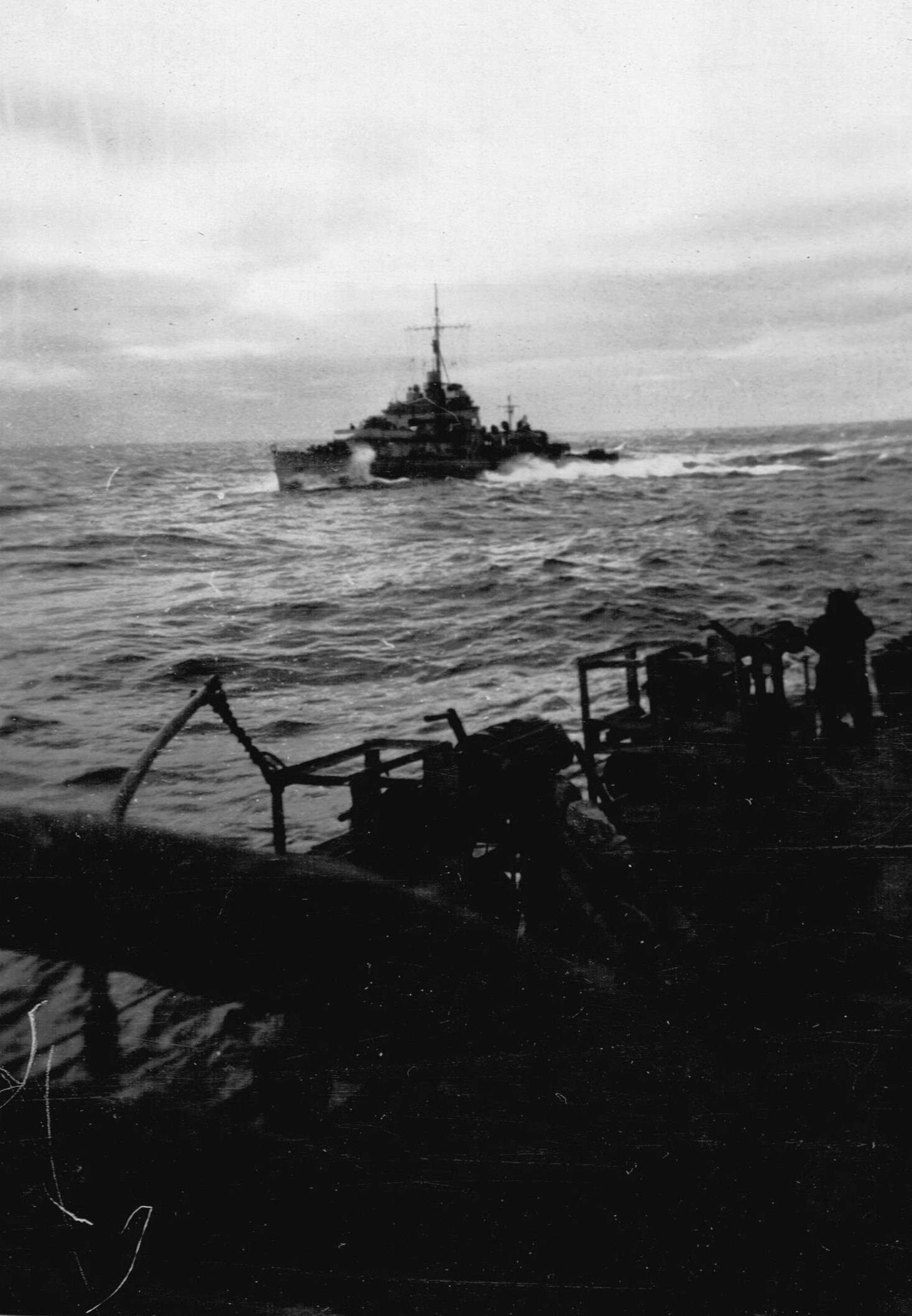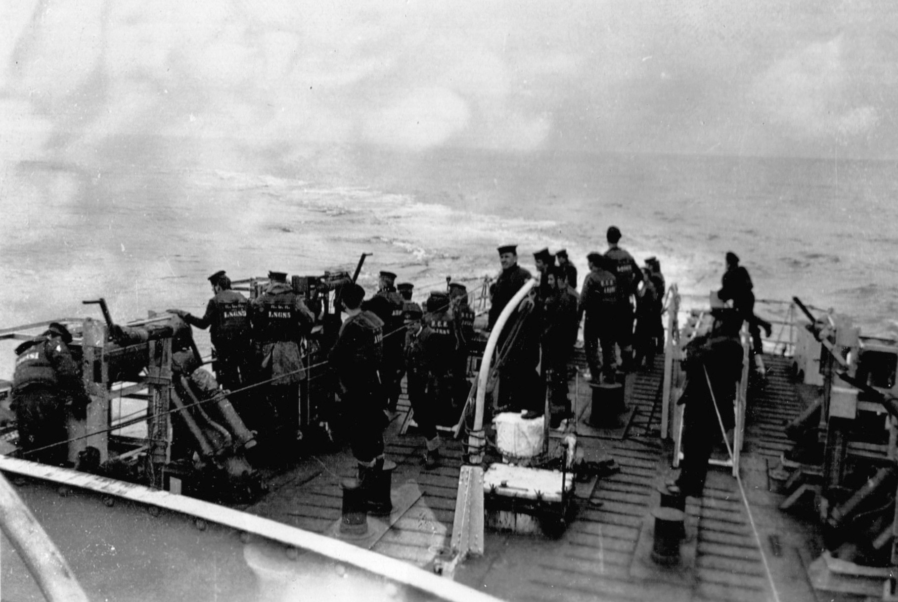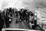 (RSR081) Escort group following in line astern of HMCS MEON. Photo taken from the port side of MEON'S after gun deck (RSR082 - RSR084) Unidentified sailors on the port side of the after gun deck on HMCS MEON (RSR085) Quarterdeck of HMCS MEON - note the rough seas in the back ground