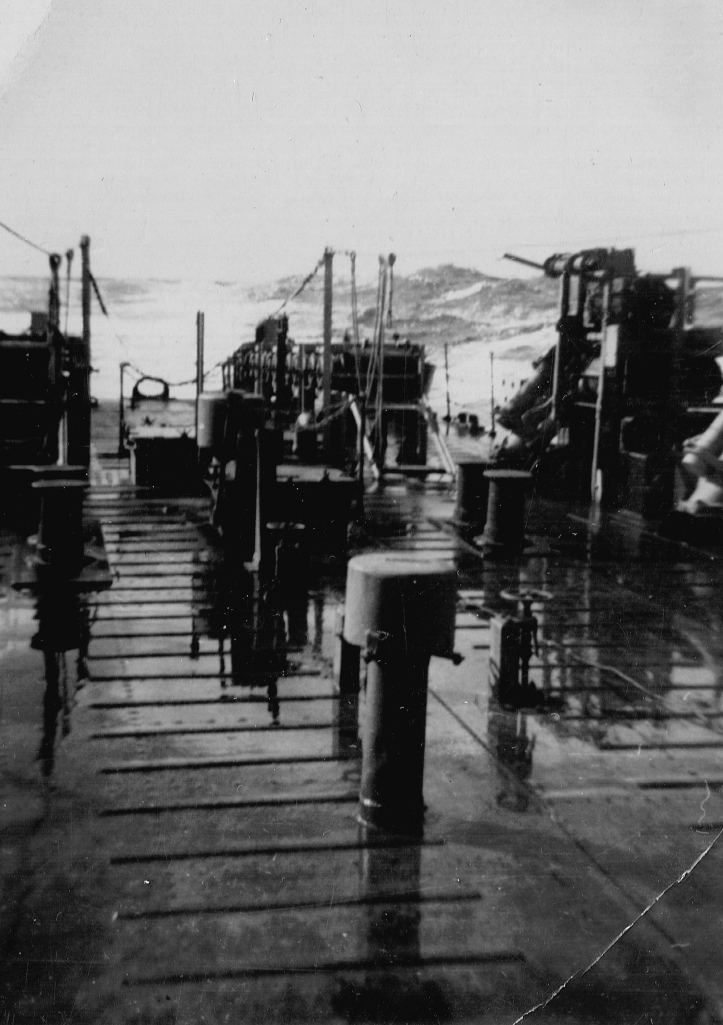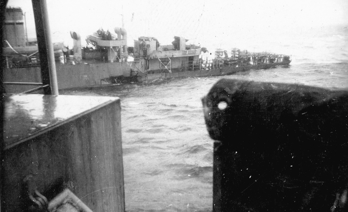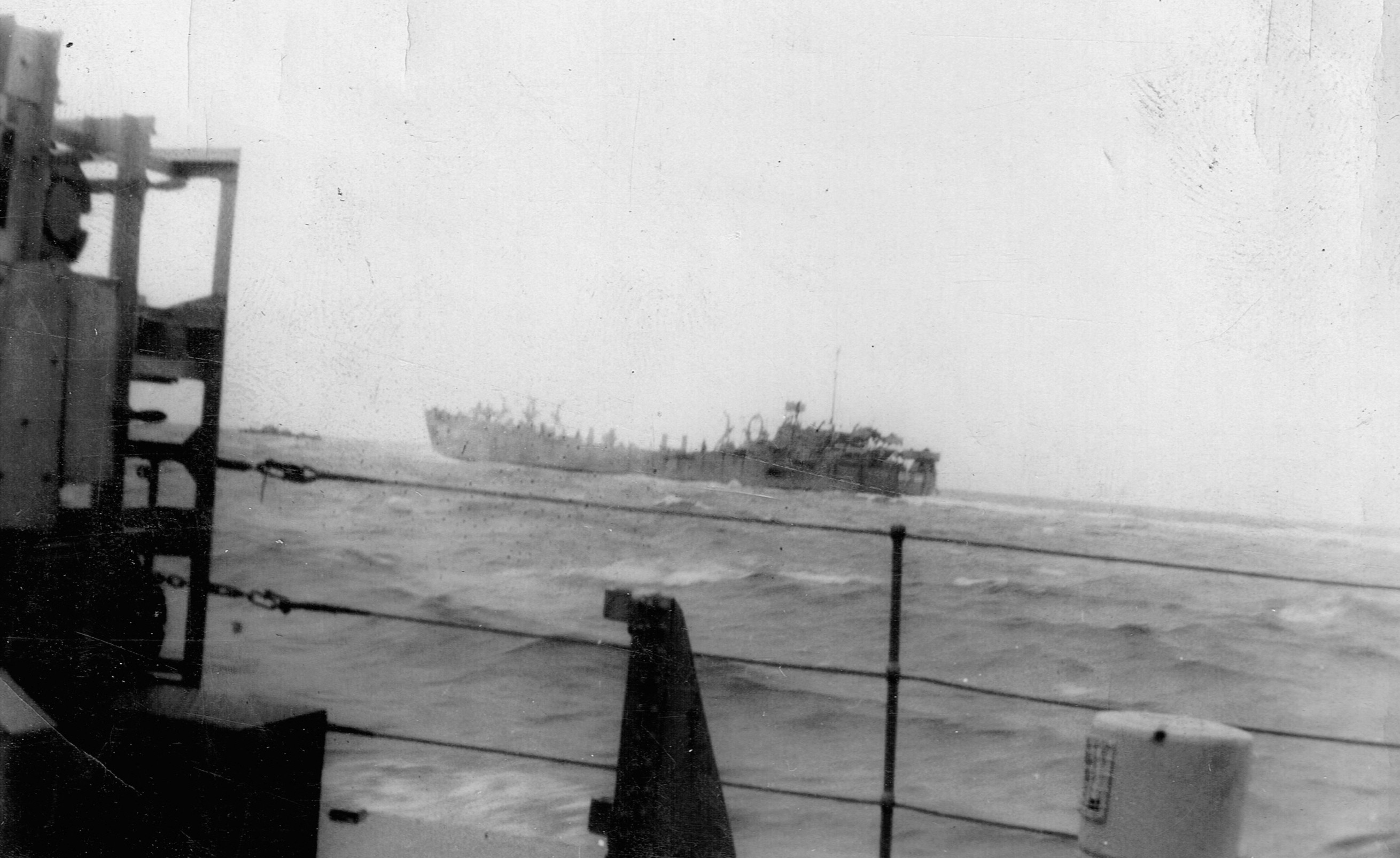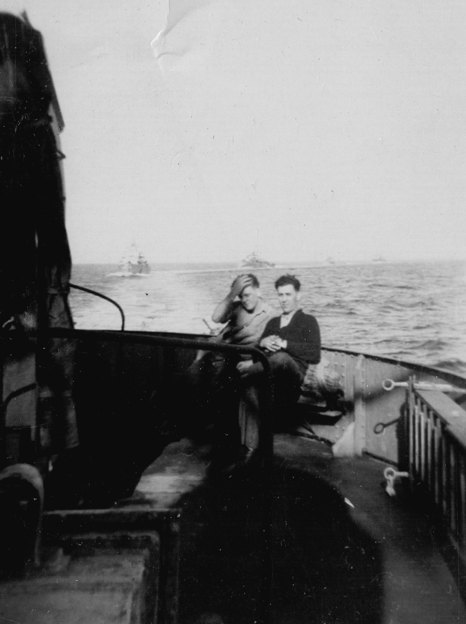 (RSR081) Escort group following in line astern of HMCS MEON. Photo taken from the port side of MEON'S after gun deck (RSR082 - RSR084) Unidentified sailors on the port side of the after gun deck on HMCS MEON (RSR085) Quarterdeck of HMCS MEON - note the rough seas in the back ground
