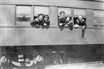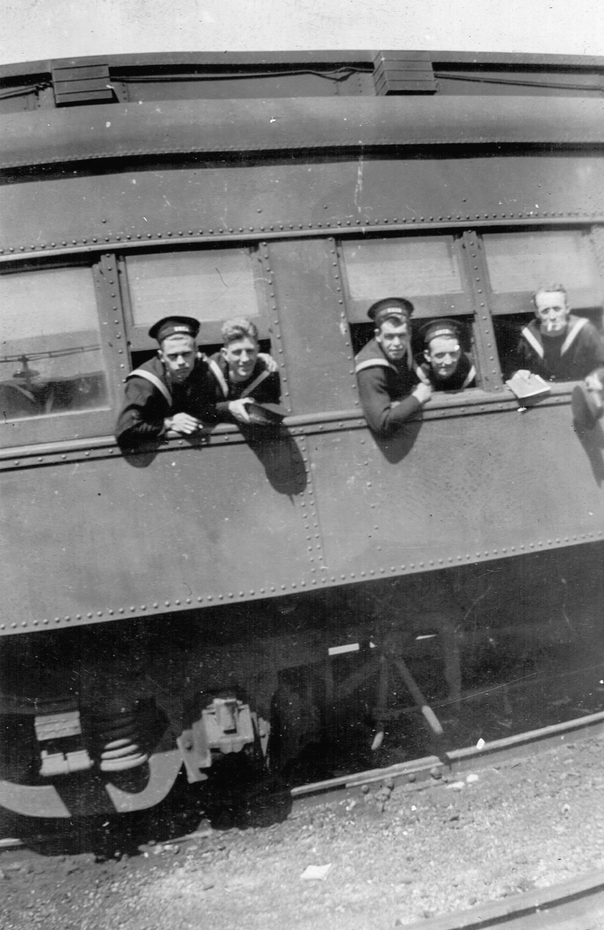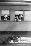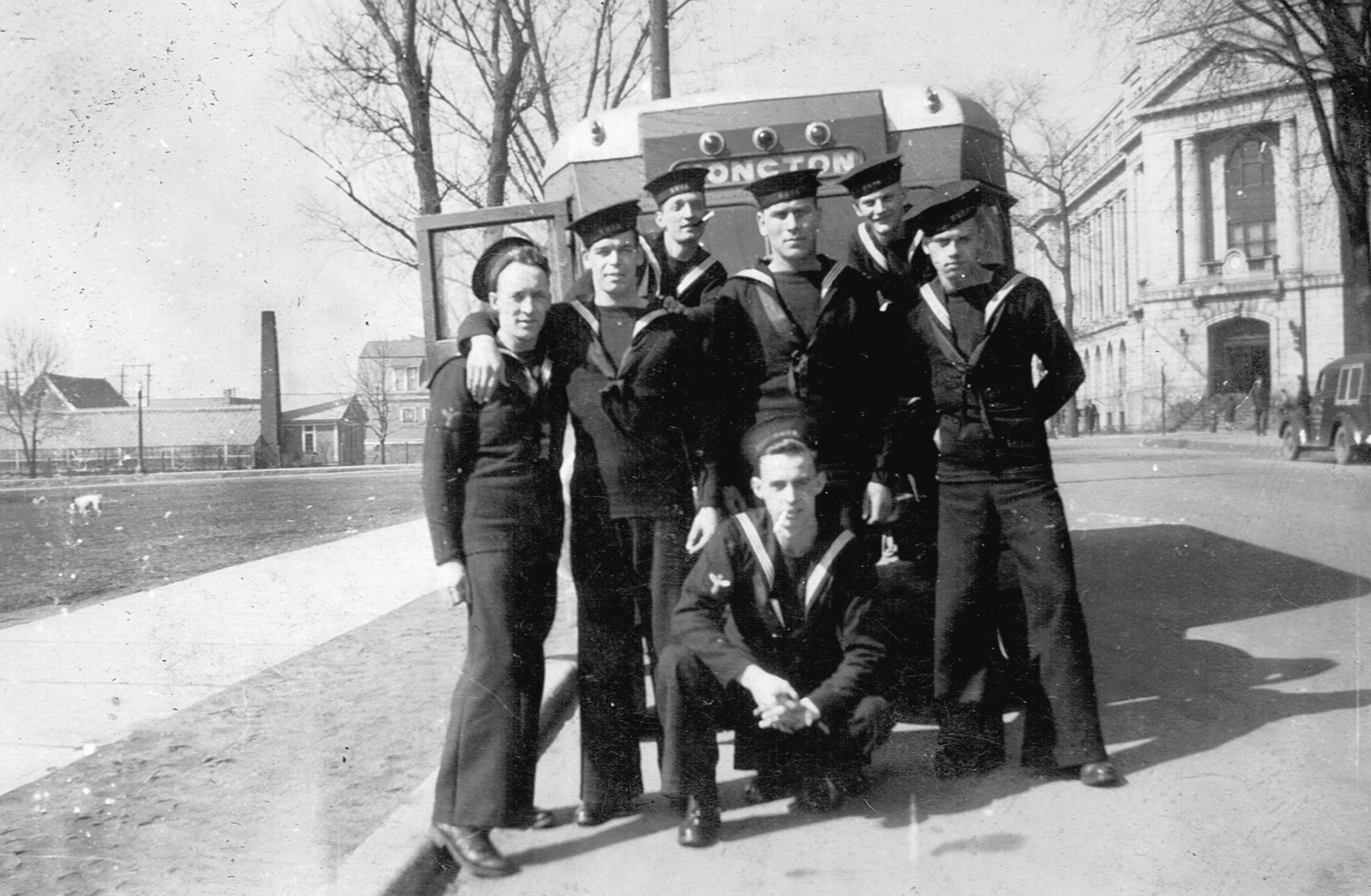 (RSR066 - RSR067) Unidentified sailors in front of a bus in Moncton, NB (RSR068 - RSR070) Unidentified sailors posing for photos from the train car windows - location unknown - though likely the train station at Moncton, NB