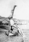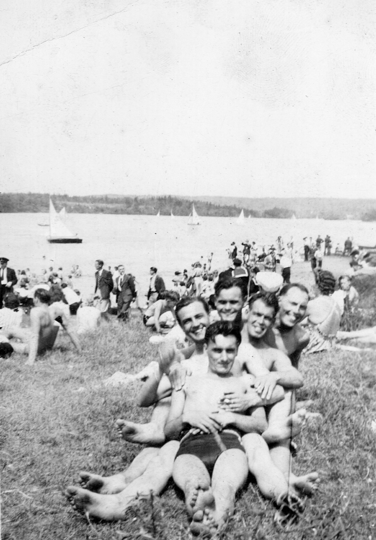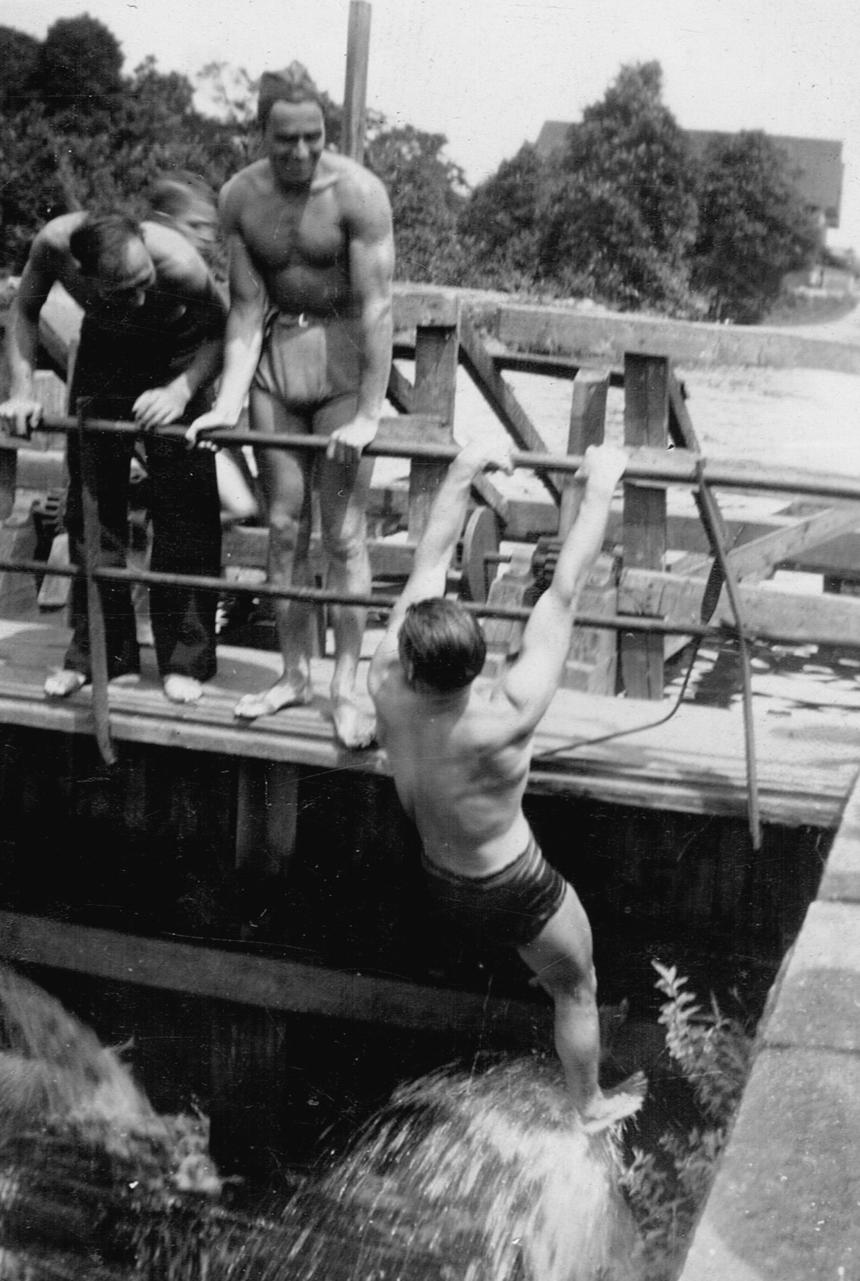 (RSR056 - RSR060) Unidentified sailors taking part in antics on the lock at the entrance to the Shubenacadie Canal on Lake Banook