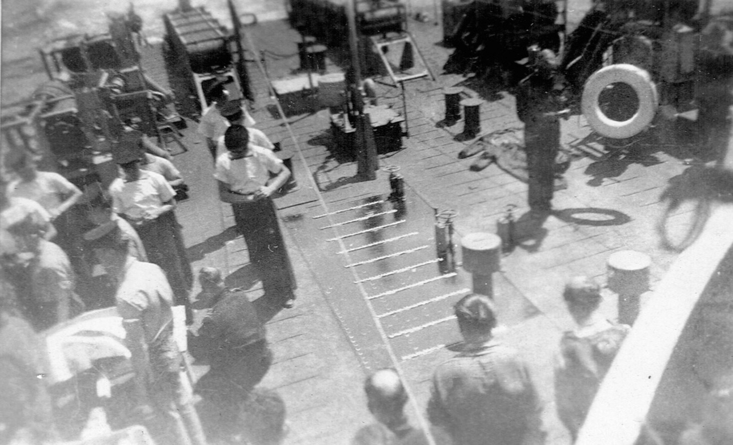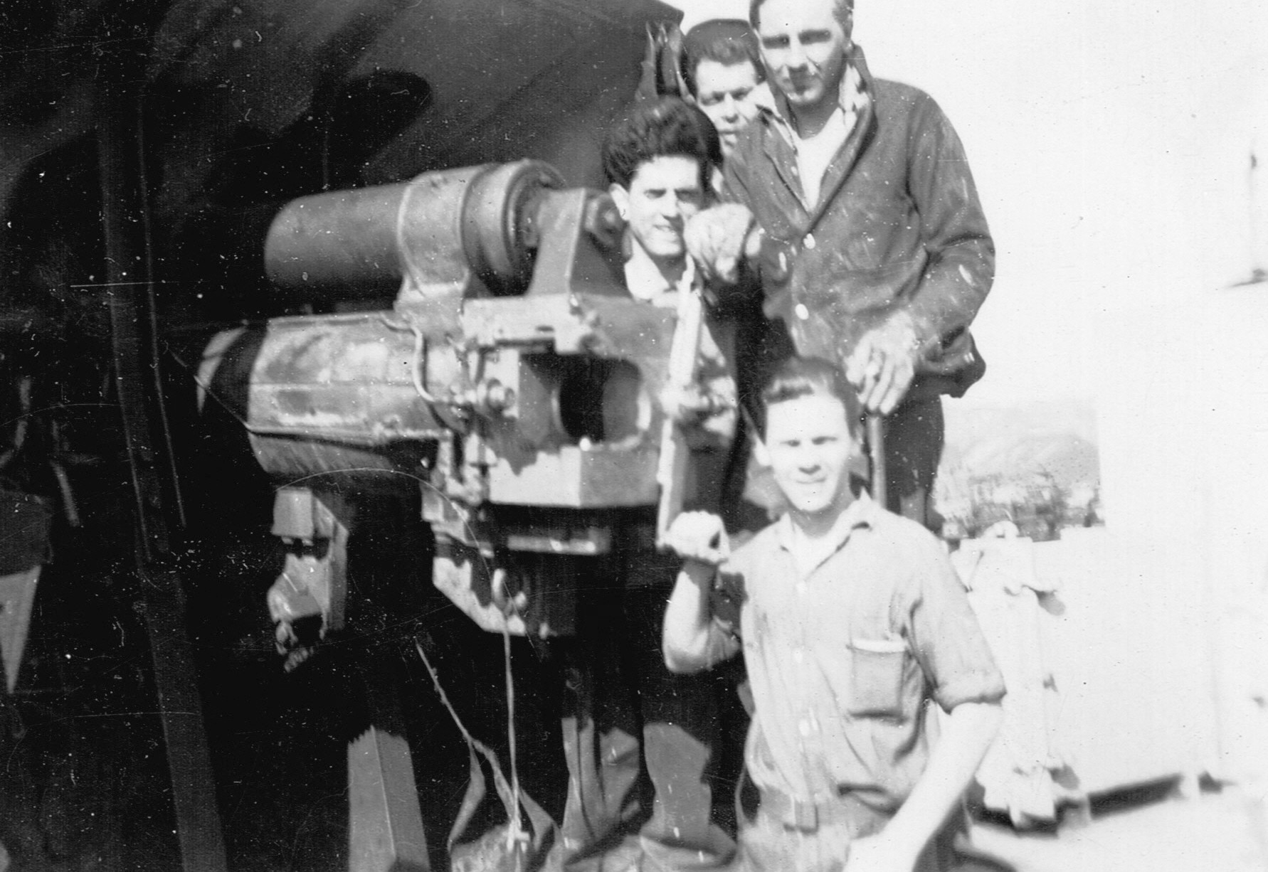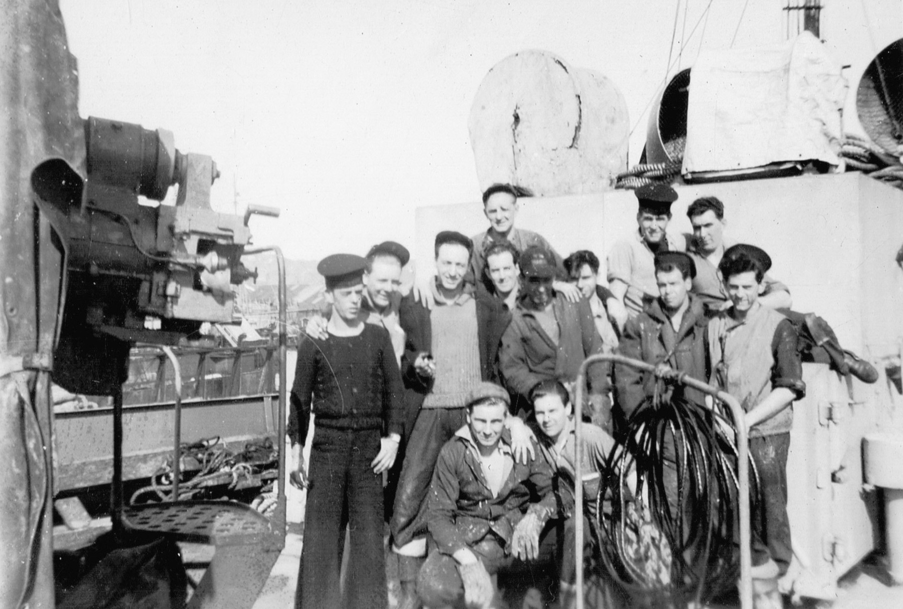 (RSR090) Four unidentified sailors by the gun on the aft gun deck on HMCS MEON (RSR091 - RSR092) Large group of unidentified sailors on the aft gun deck on HMCS MEON. Both photos are of the same group, taken a few seconds apart.
