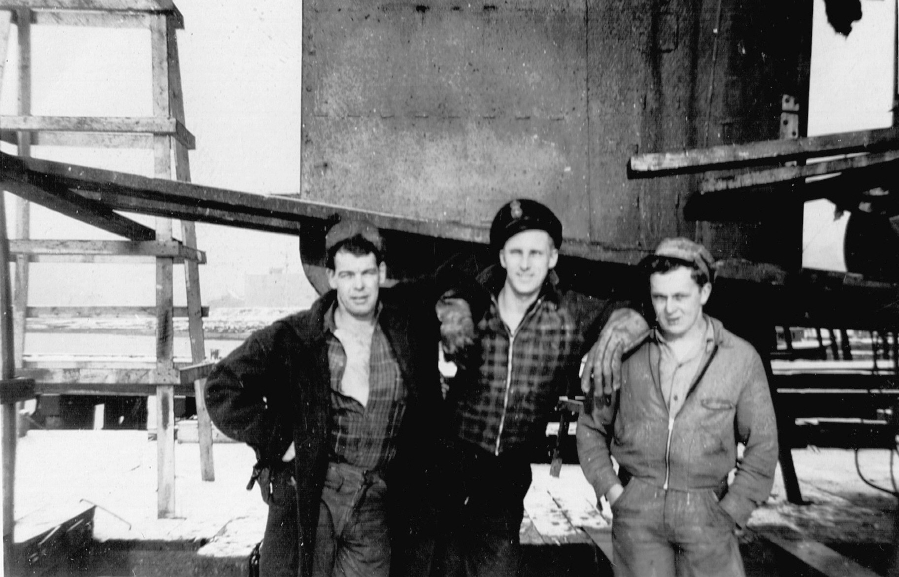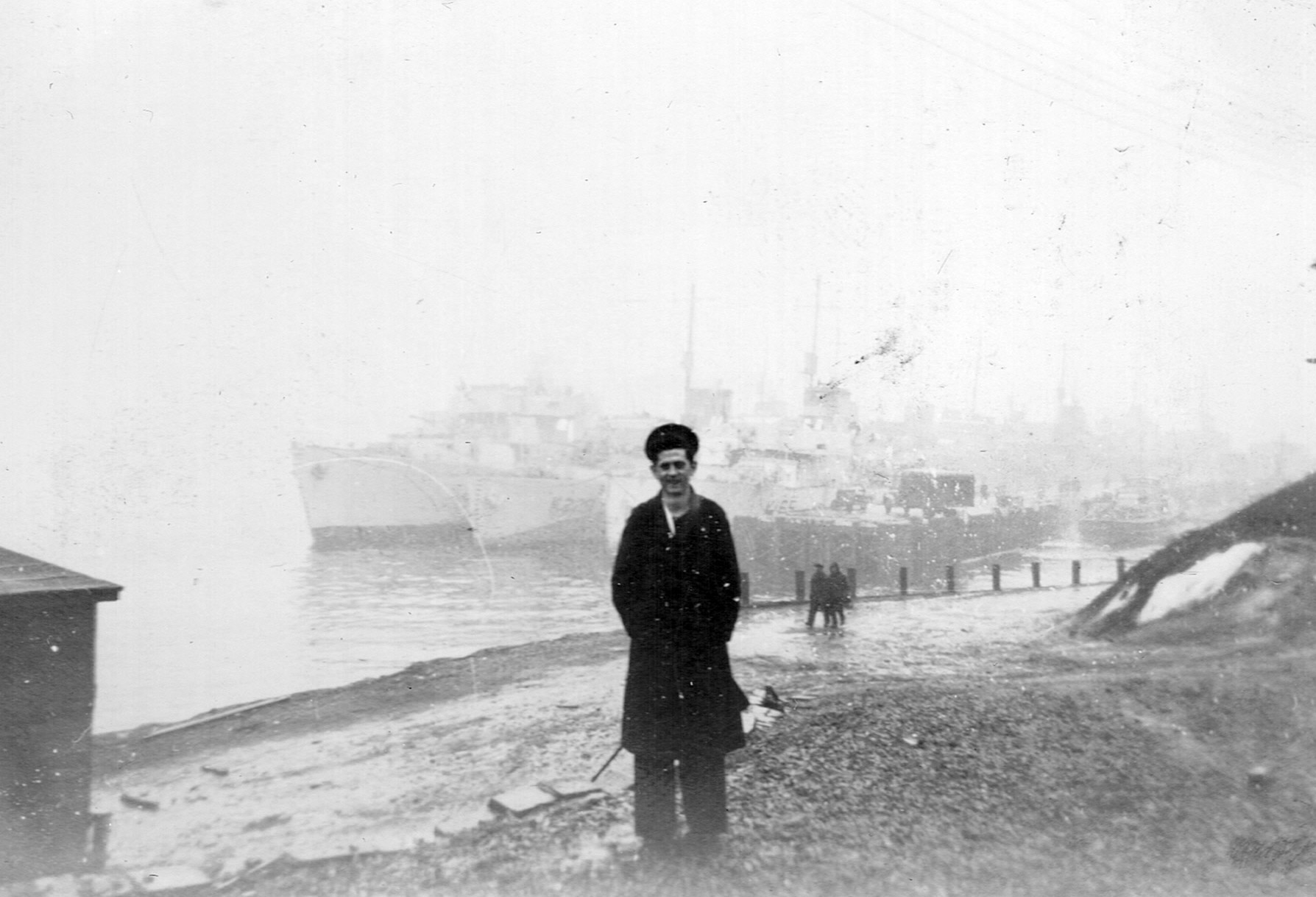 (RSR013) Unidentified sailor with ships nested in the background. HMCS BATTLEFORD K165 alongside the jetty; HMCS DUNDAS K229 centre; outboard ship unknown. Possibly HMC Dockyard Halifax (RSR014 - RSR015) Unidentified sailors doing what appears to be shoveling coal in the window of the building behind them. It is believed the photo is taken at HMCS STADACONA or one of surrounding units such as HMCS PEREGRINE or in HMC Dockyard.