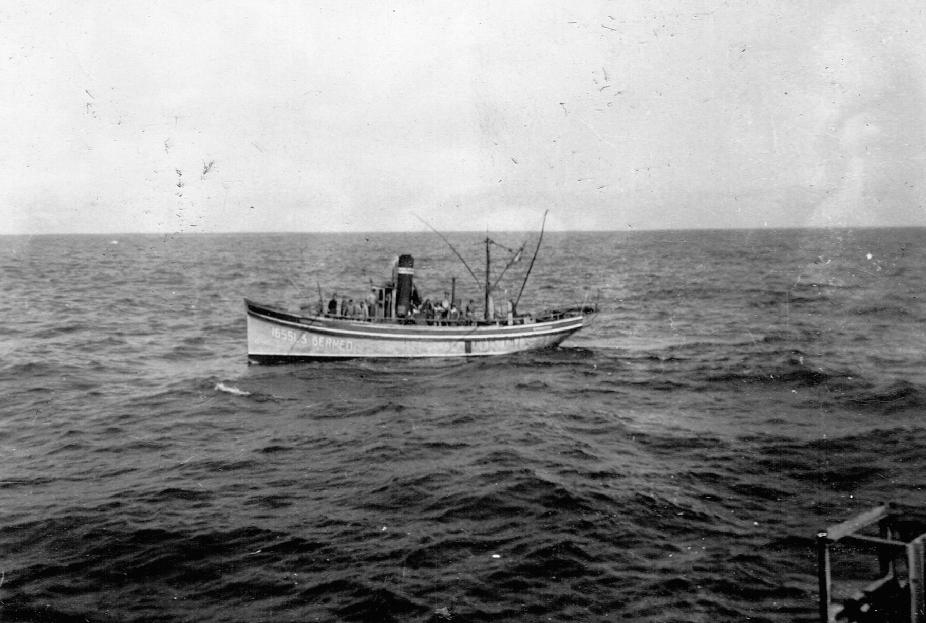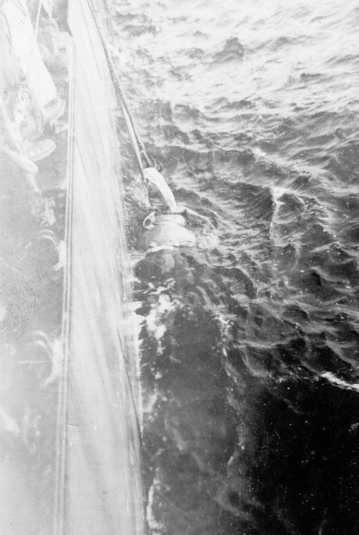 These 3 photos seem to show the recovery of the 2 bodies at sea by HMCS MEON (RSR109) The life vest on the casualty in this first photo appears to be a Luftwaffe Kapok life vest. (RSR110) This photo shows the recovery of a body grappling hook and Shepard's hook. The life vest is different from the one in photo RSR109. (RSR110) This photo shows what appears to be a casualty on the deck of HMCS MEON.