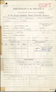 Ships served in: OTTAWA DIVISION RCNVR - Enlisted 02 Jun 1941 * Commenced Active Service 09 Jun 1941 as an Ordinary Seaman, RCNVR HMCS BYTOWN - Drafted to BYTOWN 21 Jun 1941 OTTAWA DIVISION RCNVR - Drafted to OTTAWA DIVISION RCNVR 04 Aug 1941 HMCS STADACONA - Drafted to STADACONA 19 Aug 1941 HMCS HOCHELAGA II - Drafted to HOCHELAGA II 03 Oct 1941 HMCS THE PAS - Drafted to THE PAS 22 Oct 1941 HMCS STADACONA - Drafted to STADACONA 15 Jan 1942 HMCS THE PAS - Drafted to THE PAS 23 Jan 1942 HMCS STADACONA - Drafted to STADACONA 22 Jul 1942 HMCS CORNWALLIS - Drafted to CORNWALLIS 10 Sep 1942 HMCS AVALON - Drafted to AVALON 05 Dec 1942 ML Q078 - Drafted to Q078 21 Feb 1943 HMCS STADACONA - Drafted to STADACONA 27 Jul 1943 HMCS CORNWALLIS - Drafted to CORNWALLIS 19 Aug 1943 HMCS STADACONA - Drafted to STADACONA 11 Sep 1943 HMCS NIOBE - Drafted to NIOBE 02 Nov 1943 HMCS MIMICO - Draft to MIMICO 08 Feb 1944 HMCS NIOBE - Drafted to NIOBE 14 Mar 1944 HMCS PEREGRINE - Drafted to PEREGRINE 03 Apr 1944 * Rated Able Seaman, RCNVR 09 Jun 1945 HMCS CARLETON - Drafted to CARLETON 30 Jul 1945 * Demobilized 28 Aug 1945