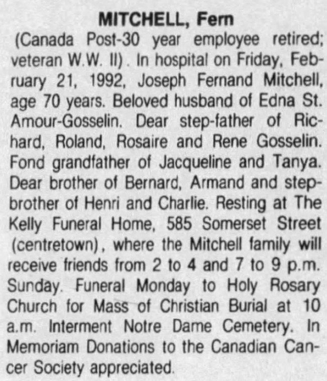 MITCHELL, Joseph Fernand Edward Philias (Fern) - Canada Post 30-year employee retired; Veteran Second World War. In hospital on Friday, February 21, 1992, Joseph Fernand Mitchell, age 70 years. Beloved husbnad of Edna St. Amour-Gosselin. Dear step-father of Richard, Roland, Rosaire and Rene Gosselin. Found grandfather of Jacqueline and Tanya. Dear brother of Bernard, Armand and step-brother of Henri and Charlie. Resting at The Kelly Funeral Home, 585 Somerset Street (centretown), where the Mitchell family will received friends from 2 to 4 and 7 to 9 p.m. Sunday. Funeral Monday to Holy Rosary Church for Mass of Christian Burial at 10 a.m. Interment Notre Dame Cemetery. In Memoriam Donations to the Canadian Cancer Society appreciated. (Click here to view the obituary as published)