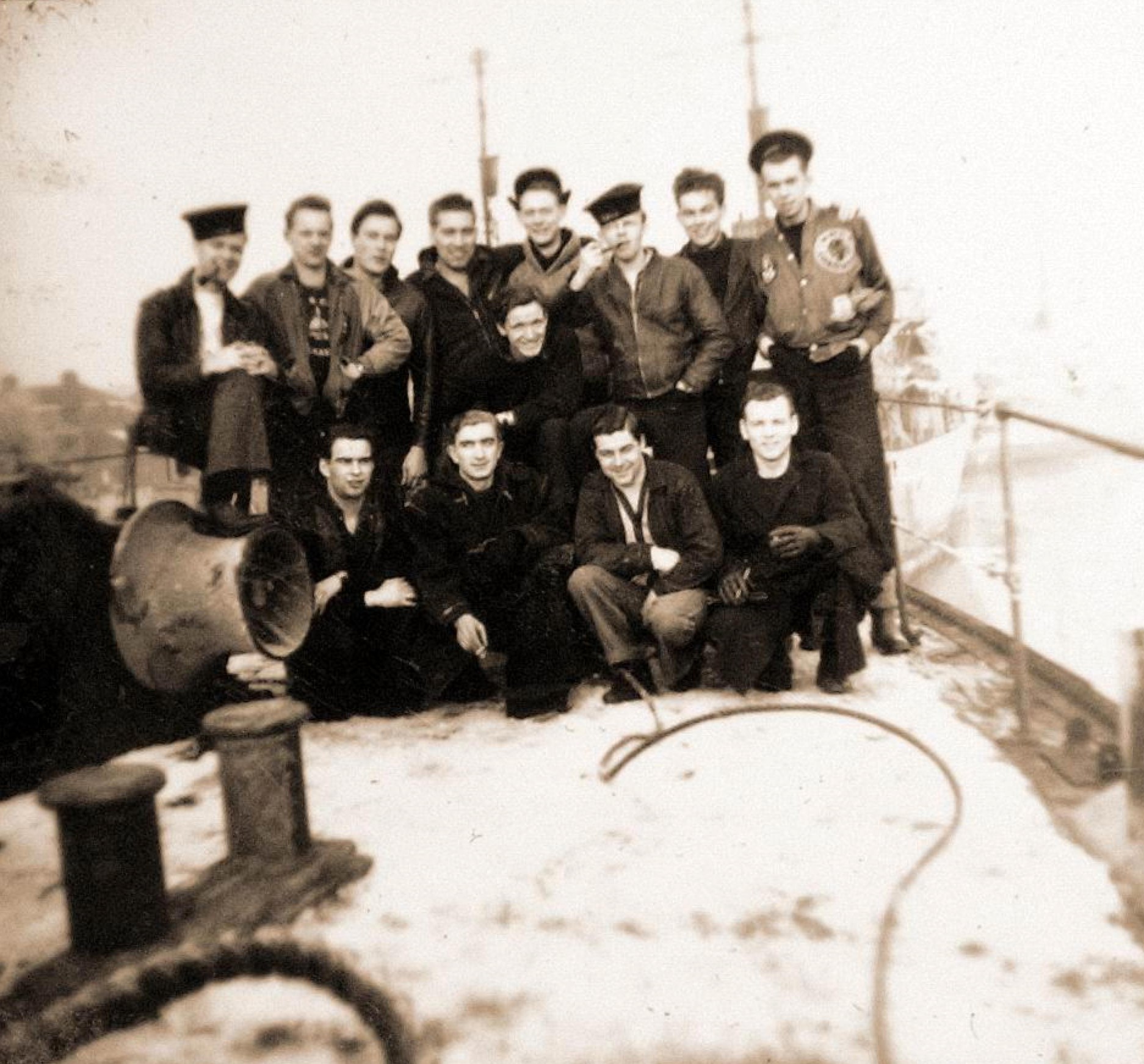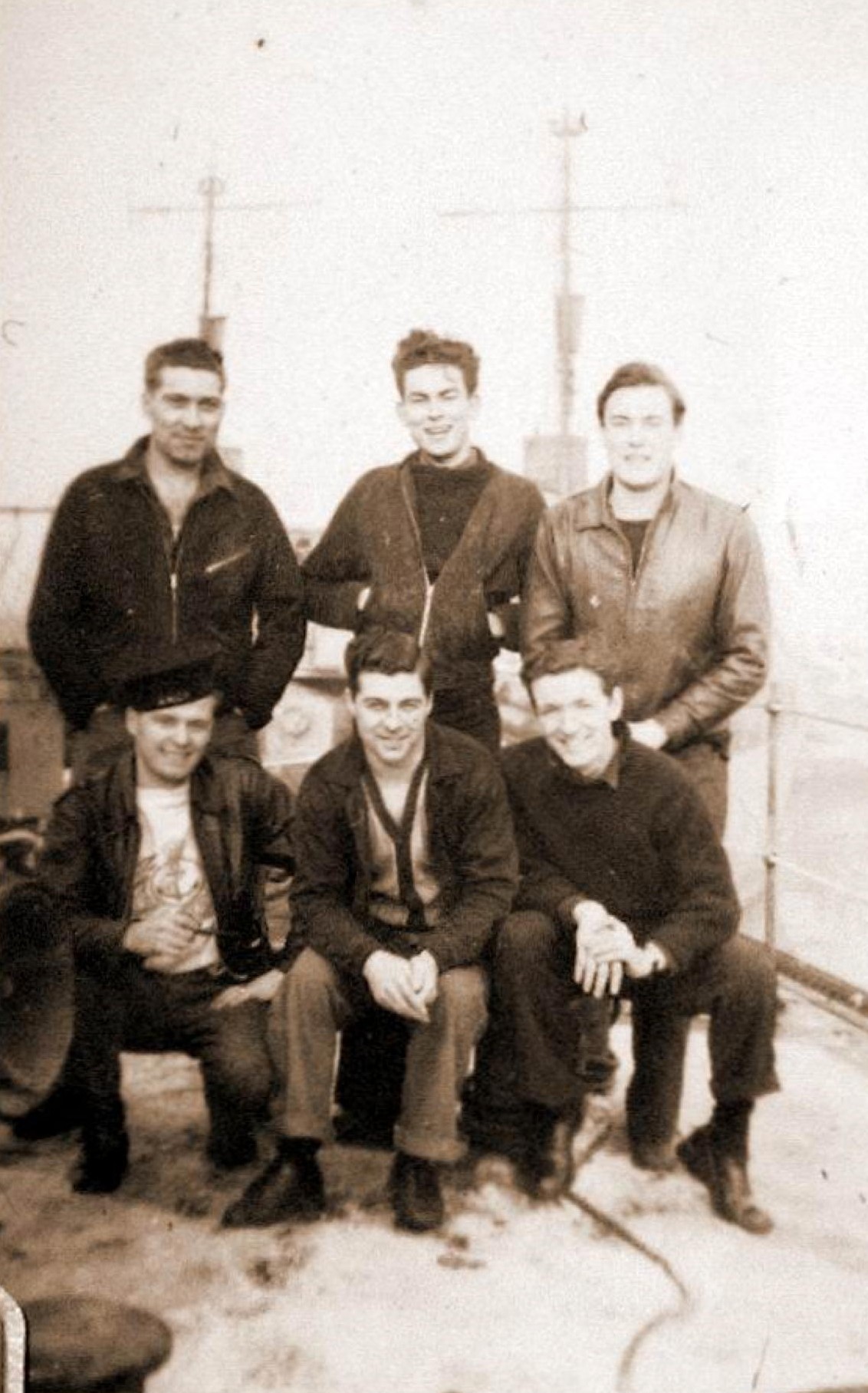 (CJR010-CJR012) Shipmates of Clarence Reid on the fo'c's'le of HMCS CHAMBLY K116 (CJR013-CRJ014) Shipmates on the fo'c's'le of HMCS CHAMBLY - Clarence Reid standing 3rd from right holding a pipe