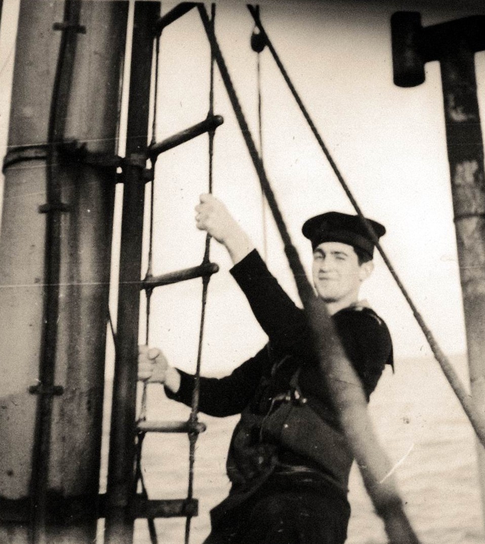 (CRJ024) Unknown sailor climbing up the mast to the crow's nest on HMCS CHAMBLY K116