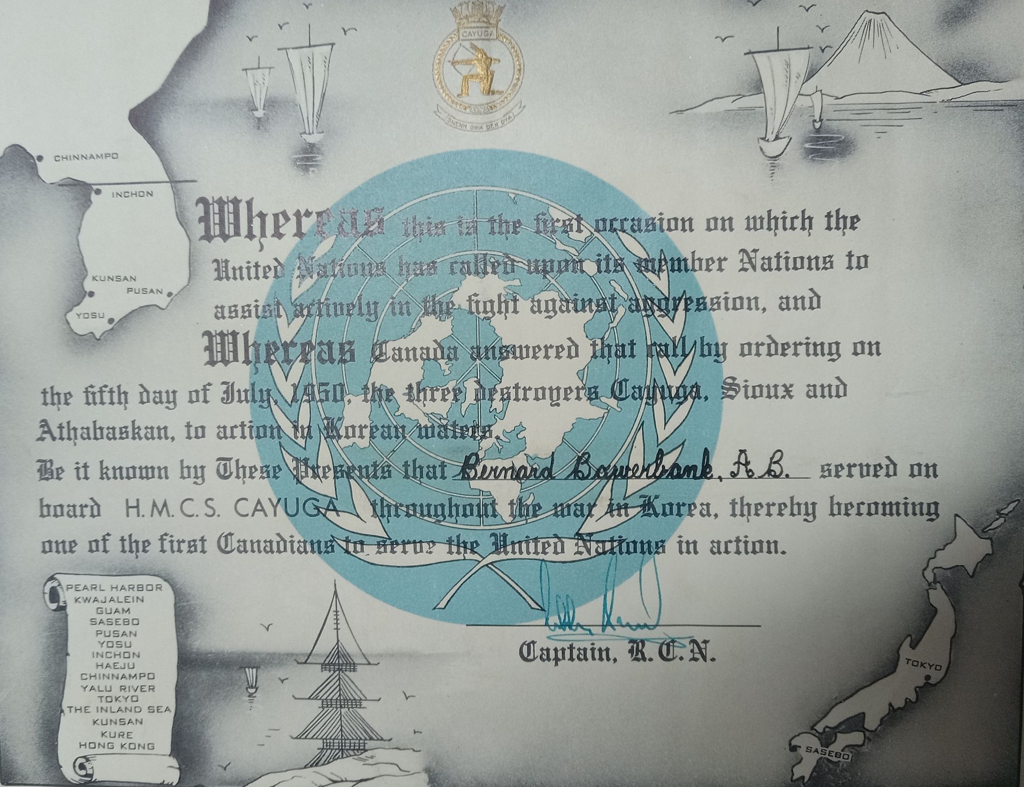 (BJB001) Seaman Bernie Bowerbank (BJB002) Certificate acknowledging AB Bowerbank's participation in the Korean War on board HMCS CAYUGA