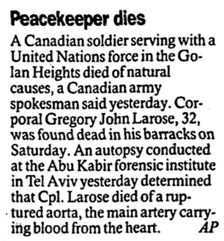 Larose, Gregory John "Rosy" - A Canadian Peacekeeper dies. A Canadian soldier serving with a United Nations Force in the Golan Heights died of natural causes, a Canadian Army spokesman said yesterday. Corporal Gregory John Larose, 32 was found dead in his barracks on Saturday. An autopsy conducted at the Abu Kabir forensic institute in Tel Aviv yesterday determined that Cpl. Larose died of a ruptured aorta, the main artery carrying blood from the heart.