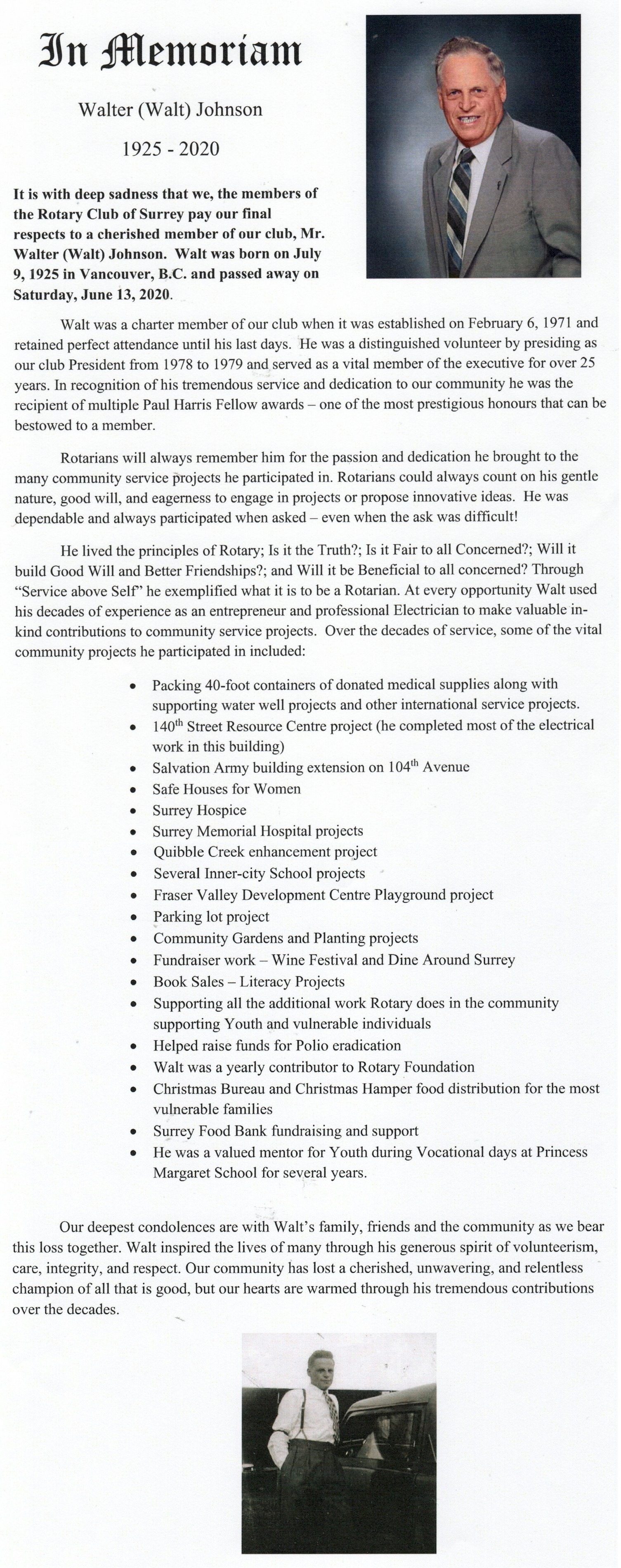 Walt was a proud Rotarian and founding member of the Rotary Club of Surrey, where he was described as a "Cherished, unwavering and relentless champion of all that is good" and held a perfect attendance record of over 43 years. He was a Navy war veteran and a recipient of the Queen Elizabeth Golden Jubilee Medal in 2002.
