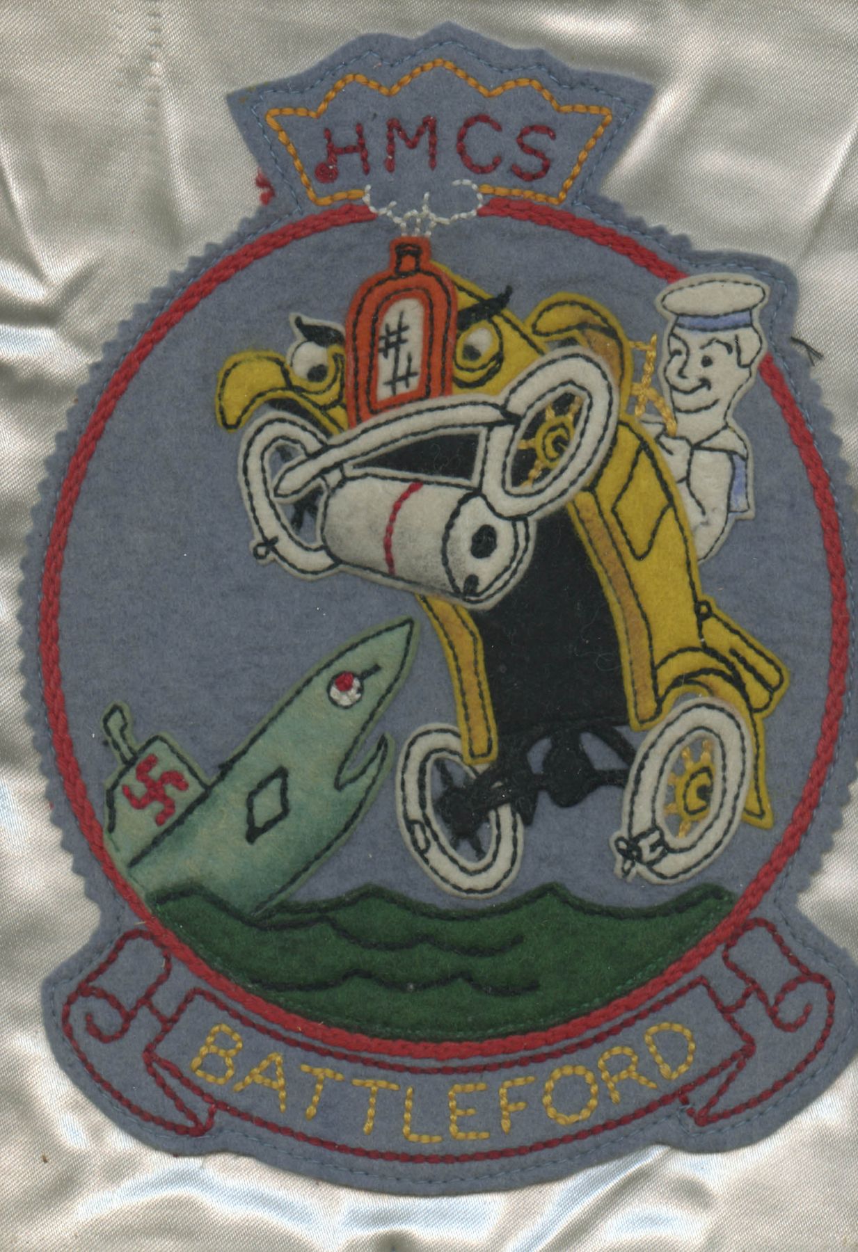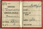 (RD001) HMCS BATTLEFORD Station card for A/L/Sto Doucette (RD002) HMCS BATTLEFORD K165 jacket patch (RD003) Two unknown sailors on HMCS BATTLEFORD K165. One of the sailors may be Raymond Doucette