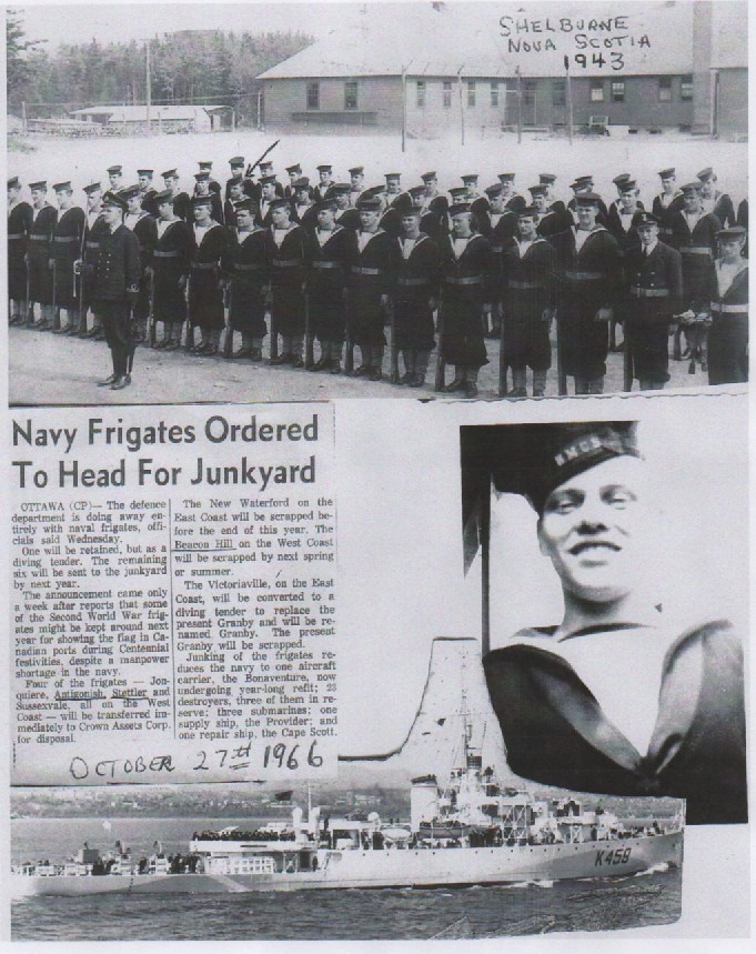 (HFB001 - HFB002) Stoker Harry Bryant (HFB003) Stoker 1st Class Harry Bryant (HFB004) Collage: Guard at HMCS SHELBURNE. Harry Bryant indicated by the arrow // Article on several frigates being readied for scrap - dated 27 Oct 1966 // Photo of Stoker Harry Bryant // Photo of HMCS TEME K458 (HFB005) Authorization for Harry Bryant to wear the War Service Badge Courtesy of Ray Bryant