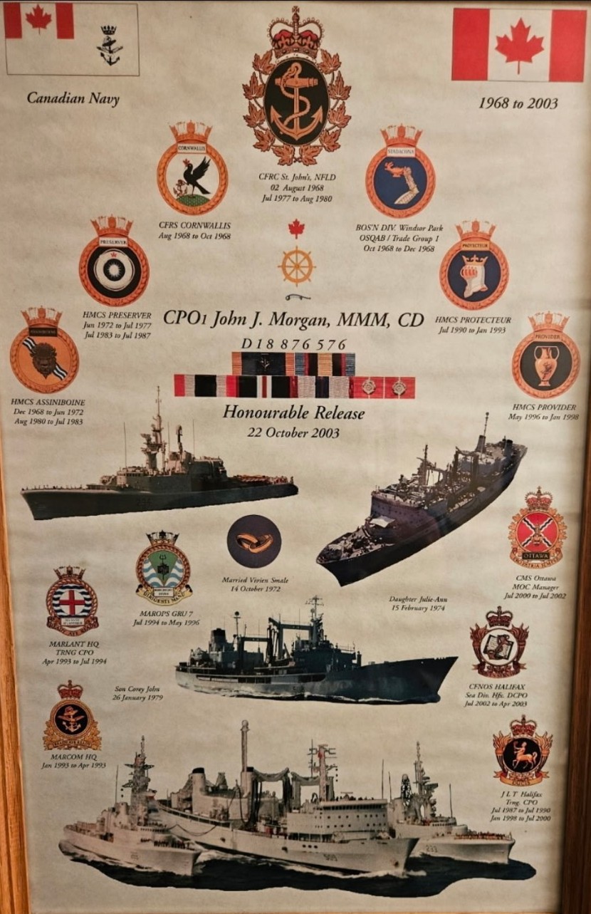 Ships served in: CFRC ST JOHN'S - Enlisted 02 Aug 1968 CFB CORNWALLIS (CFRS) - Aug 1968 - Oct 1968 CFB HALIFAX, Windsor Park, Bos'n Div for OSQAB and trade Group 1 course - Oct 1968 - Dec 1968 HMCS ASSINIBOINE - Dec 1968 - Jun 1972 HMCS PRESERVER - Jun 1972 - Jul 1977 CFRC ST JOHN'S, Recruiting - Jul 1977 - Aug 1980 HMCS ASSINIBOINE - Aug 1980 - Jul 1983 HMCS PRESERVER - Jul 1983 - Jul 1987 CFB HALIFAX, Junior Leadership Training Division Jul 1987 - Jul 1990 as Training Chief Petty Officer HMCS PROTECTEUR - Jul 1990 - Jan 1993 MARCOMHQ Jan 1993 - Apr 1993 MARLANTHQ - Apr 1993 - Jul 1994 as Training Chief Petty Officer MAROPSGRU 7 - Jul 1994 - May 1996 HMCS PROVIDER - May 1996 - Jun 1998 CFB HALIFAX, Junior Leadership Training Division Jun 1998 - Jul 2000 as Training Chief Petty Officer NDHQ OTTAWA, CMS, MOC Manager - Jul 2000 - Jul 2002 CFB HALIFAX, CFNOS, Sea Div Division Chief Petty Officer - Jul 2002 - Apr 2003 * Retirement Leave * Honourably Released 22 Oct 2003