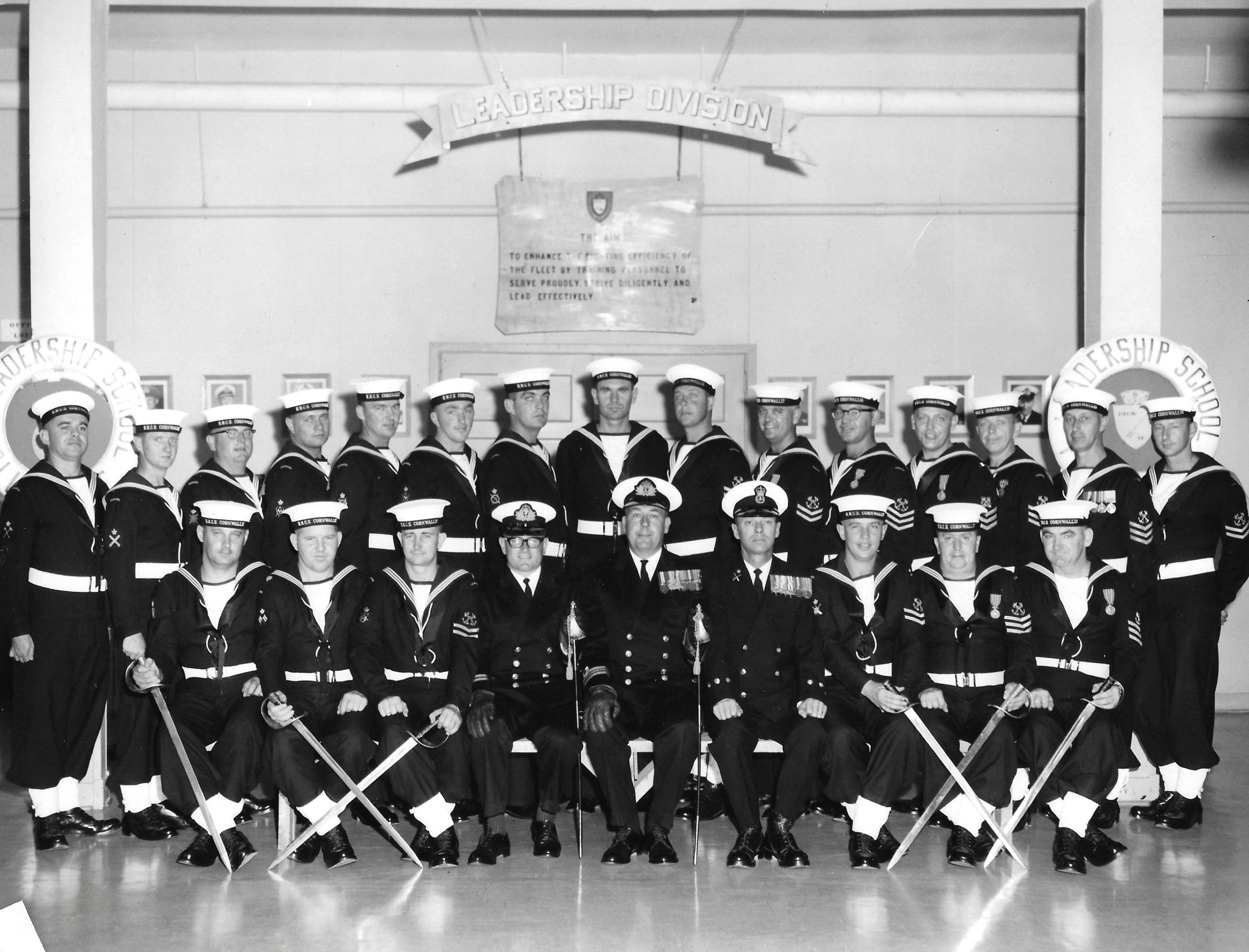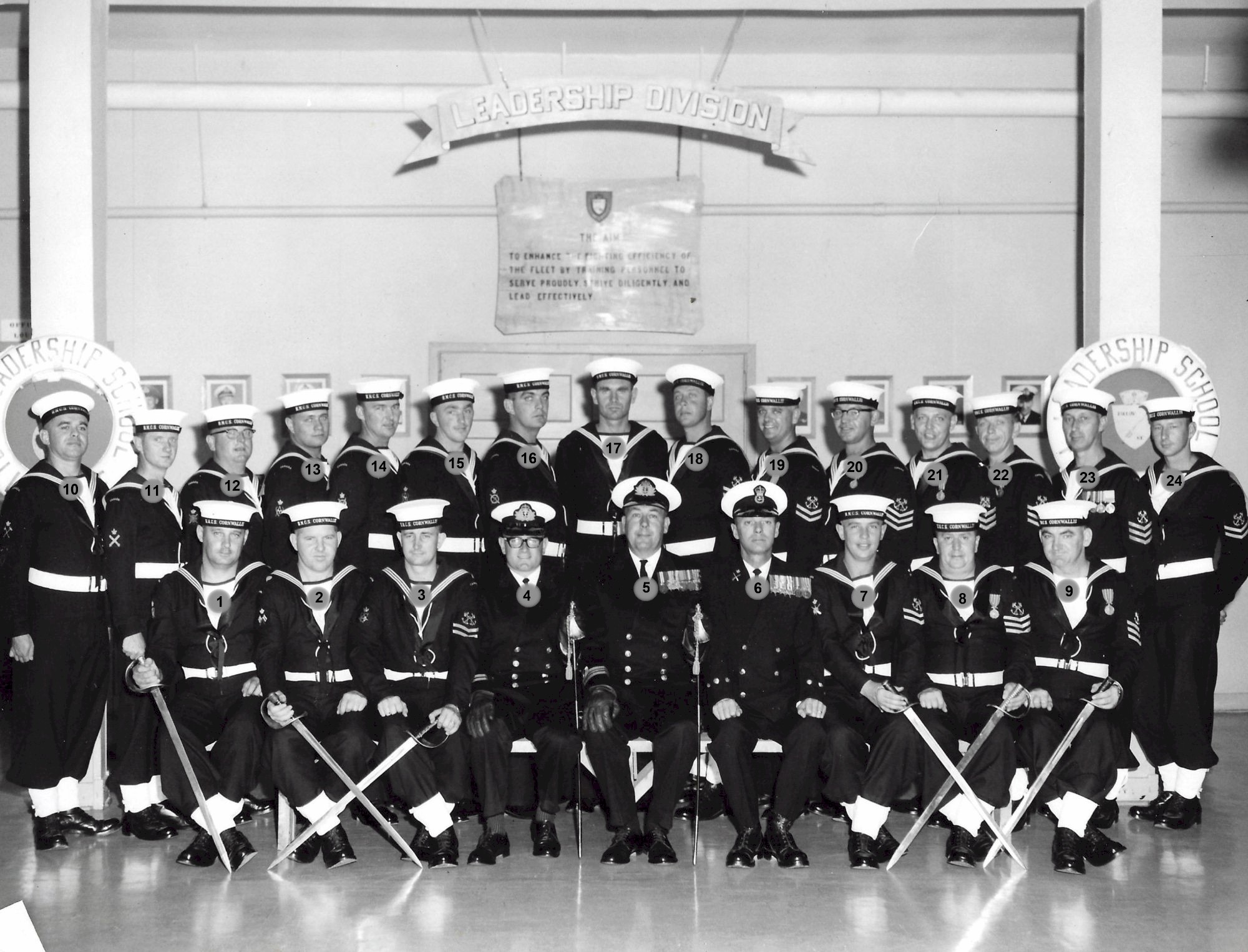 Petty Officers' Leadership Course Jun-Jul 1966 HMCS CORNWALLIS Click on the above photo to view a larger image Click here to view the photo with staff and students numbered for identification (1) Bosjeli (2) Unknown (3) Mackenzie (4) Jennings, Lt, (5) Smith, LCdr (7) Keysell, CPO (8) Unknown (9) Duncan (10) Buchanan (11) Robinson (12) Donnelly (12) Edmongs (13) Holden (14) Doak (15) Macintosh (16) Spargo (17) Coughlin (18) Fitzgerlad (19) Morsh (20) Unknown (21) Unknown (22) Blades (23) Haines (24) Buote From the collection of Dave Coughlin Courtesy of Dave Coughlin