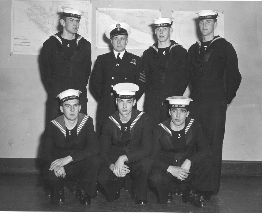 Radar Plotter Trade Group 3 Class, 1955 Click on the above photo to view a larger image (1) Pederson (2) Jack (3) Paquette, Ernie (4) Dunsmore (5) Bridges, Rick, P1,RPI (6) Noble, Dick (7) Lundy From the collection of Rick Bridges, C2RPI, RCN