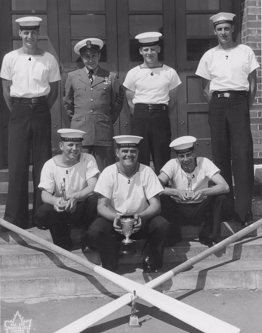 Radar Plotter Trade Group 2 Class, Feb-Dec 1956 1956 Fleet Regatta Boats Crew Winners Click on the above photo to view it without numbers (1) Yetman (2) Peterson, R.J. (3) McEachern (4) Evans (5) Bridges, Rick, P1RPI (6) Dyck (7) Hlasny, Steve From the collection of Rick Bridges, C2RPI, RCN