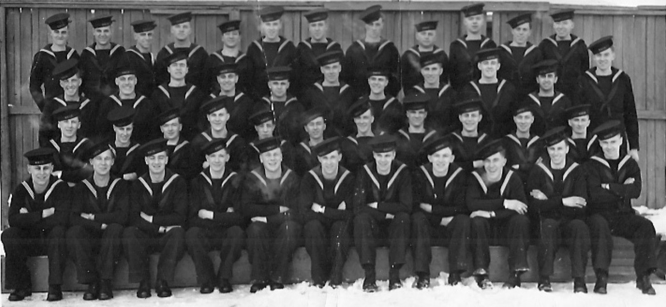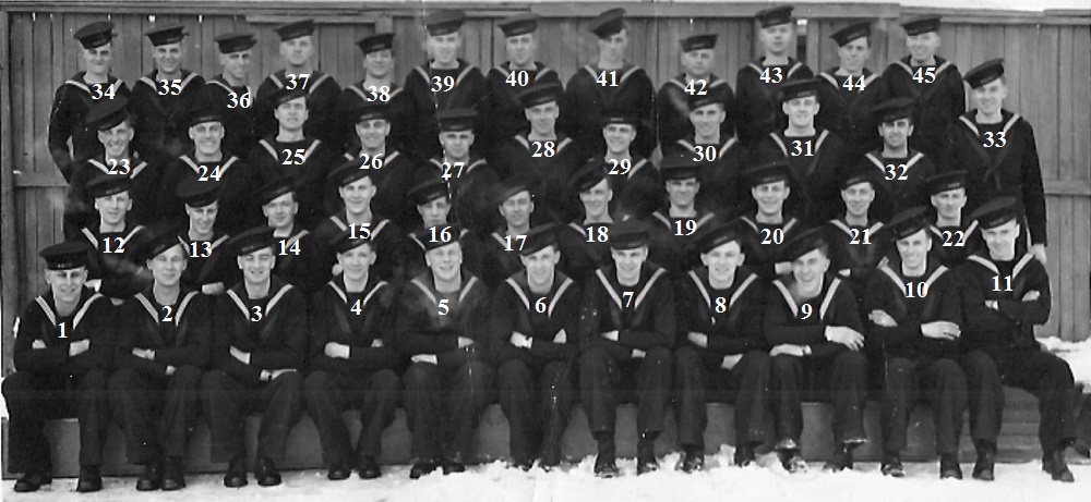 Front: L-R: J. Parker, G.M. Cameron, D.C. Corner, A. Stewart, Stoker 11 A.E. Laframboise, J.B. McDonald, M. Adams, J. Elvish, Stoker II O. Hickey, A.P. Shewchuk, C. Scotia, Stoker II J. Yatcheson, S.E. Maley, H. Hamilton, L. Peppard, Stoker II D. McLeod 2nd row: L-R: Stwd P. Connelly, J. Coutts, W.A. George, Stwd H. Nicol, D.G. Straughan, P. Carroll, I.L. Andrychuk, Stoker II D.F. Silvagi, A. Leon, W.C. Ansley, R.E. Young, J. Mihichuk, N. Zrobok, S. Buick, Cook F. James Back Row: L-R: Stoker II J. McKee, F. Gaving, Stoker II K. Grown, M. Naydo, Stoker II P. Sargent, A. McRie, Stoker II R. Findlay, R. Webster, A. Kukko, H.J. Ksoki, C.F. Brooks, W. Dawson, B. Sawchuk, W. Jarva and D. Murray. ** J. Paker and H.J. Koski, shown in the photo did not go. They were replaced in the draft by G. Gauthier and F.L. Brickson, not in the picture.