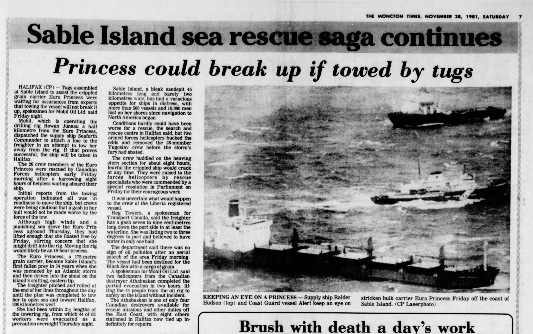 On 26 Nov 1981, she was dispatched, along with ATHABASKAN and PRESERVER, to the aid of the M.V. Euro Princess, which was badly holed and drifting down on the drill-rig Rowan Juneau, off Sable Island. Rescue helicopters took off the ship's crew, while ATHABASKAN’S Sea King evacuated 44 from the drill-rig despite 60-knot winds. This procedure had to be done “free-deck” at both ends, owing to a malfunction of ATHABASKAN'S Beartrap. The abandoned merchant ship was recovered by CGS Alert.