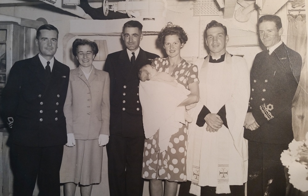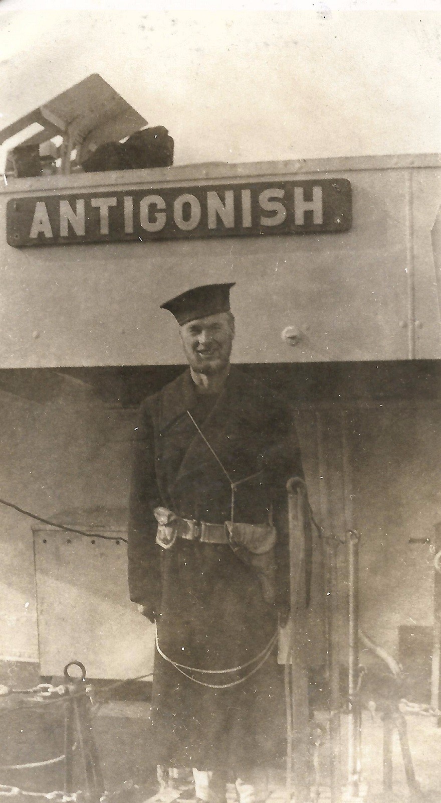 (ANT001) Christening ceremony for baby Mark Osburn (being held by his mother) on HMCS ANTIGONISH K661, Jul 1944. His father, Lt Anthony George Osburn, XO of ANTIGONISH, is 3rd from left. 1st on left, Tom Nichol; 1st on right LCdr Raiffe Dillon Barrett, RCNR, CO // From the collection of Anthony Osburn // Courtesy of Mark Osburn (ANT002) HMCS ANTIGONISH K661 - 15 Nov 1944 (ANT003) Transcription of newspaper article on HMCS ANTIGONISH search for survivors of HMCS SHAWINIGAN // Source: Service file of Tel Howard Barlow (ANT004) Unknown sailor as Quartermaster on HMCS ANTIGONISH K661 // From the collection of Ron Critchley // Courtesy of Diane Brown (ANT005) HMCS ANTIGONISH K661 // Photographer: Walter E. Frost // Source: City of Vancouver Archives