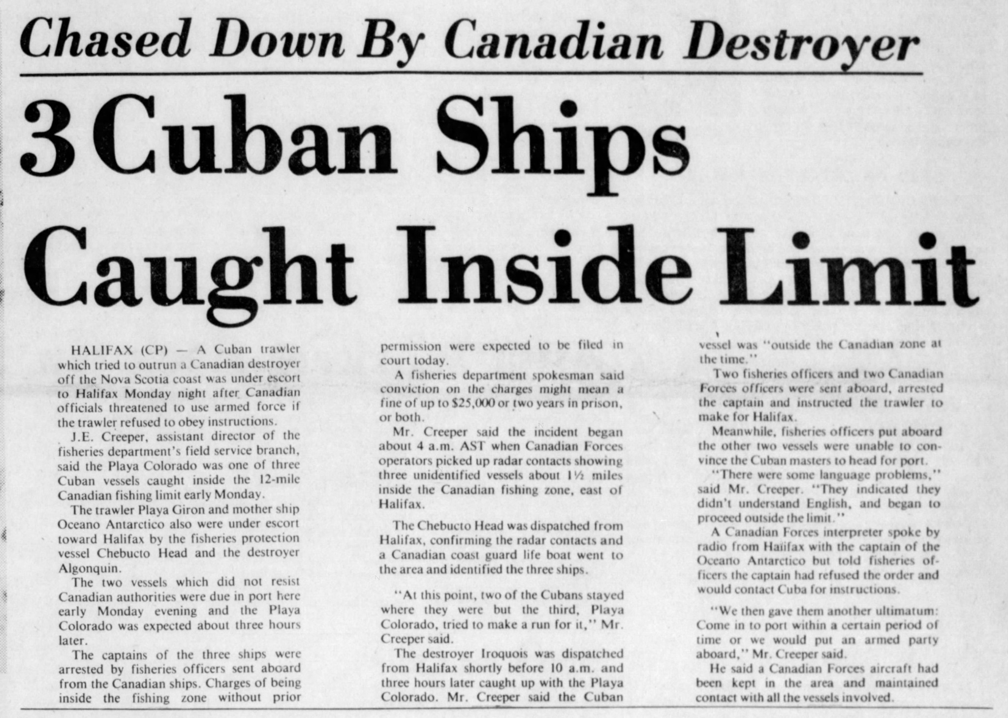 In Nov 1976 three Cuban trawlers were found illegally fishing in Canadian territorial waters. Two followed the directions of Fisheries Patrol Officers while the third made a run for it. HMCS ATHABASKAN was dispatched to intercept it and escorted it into Halifax.