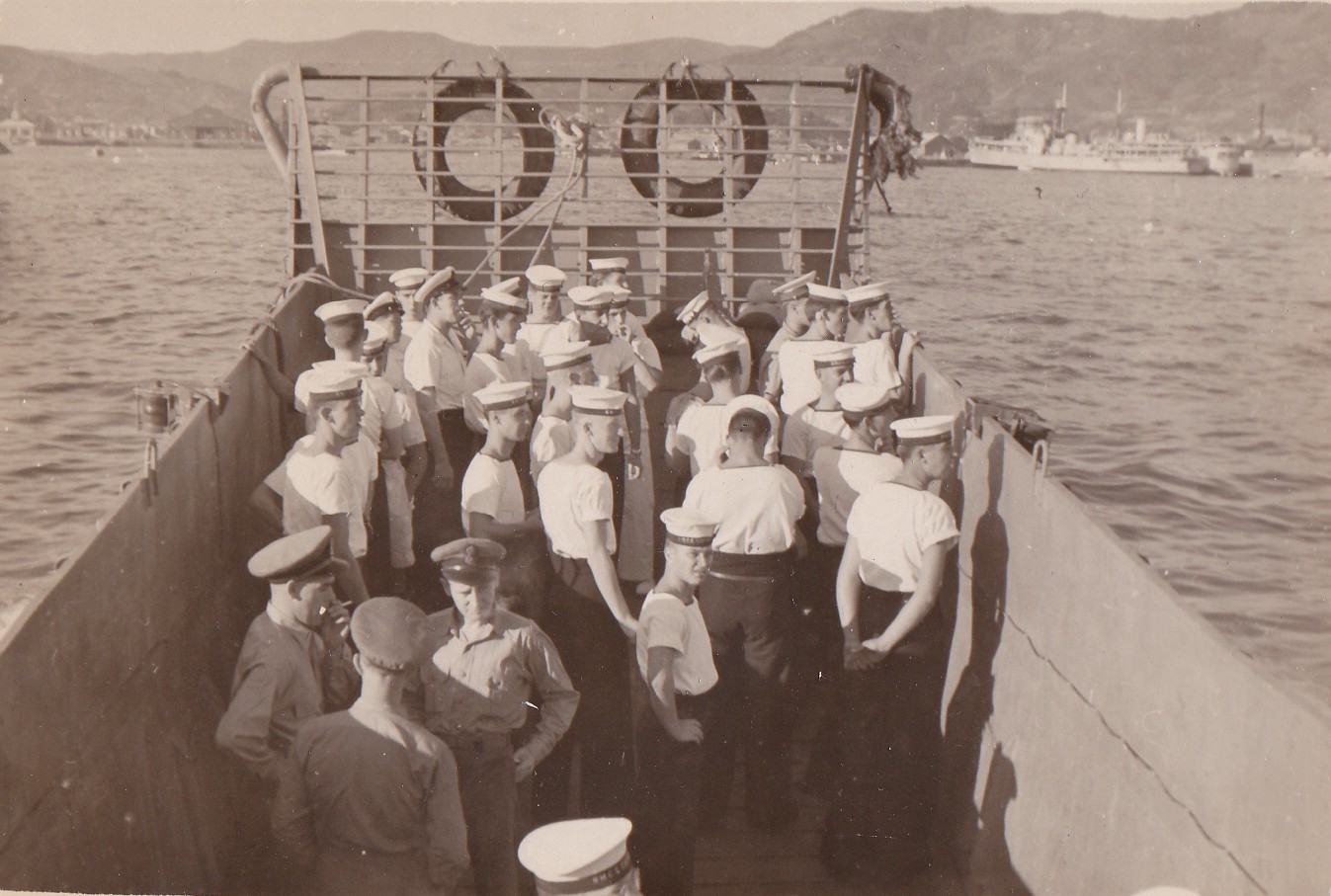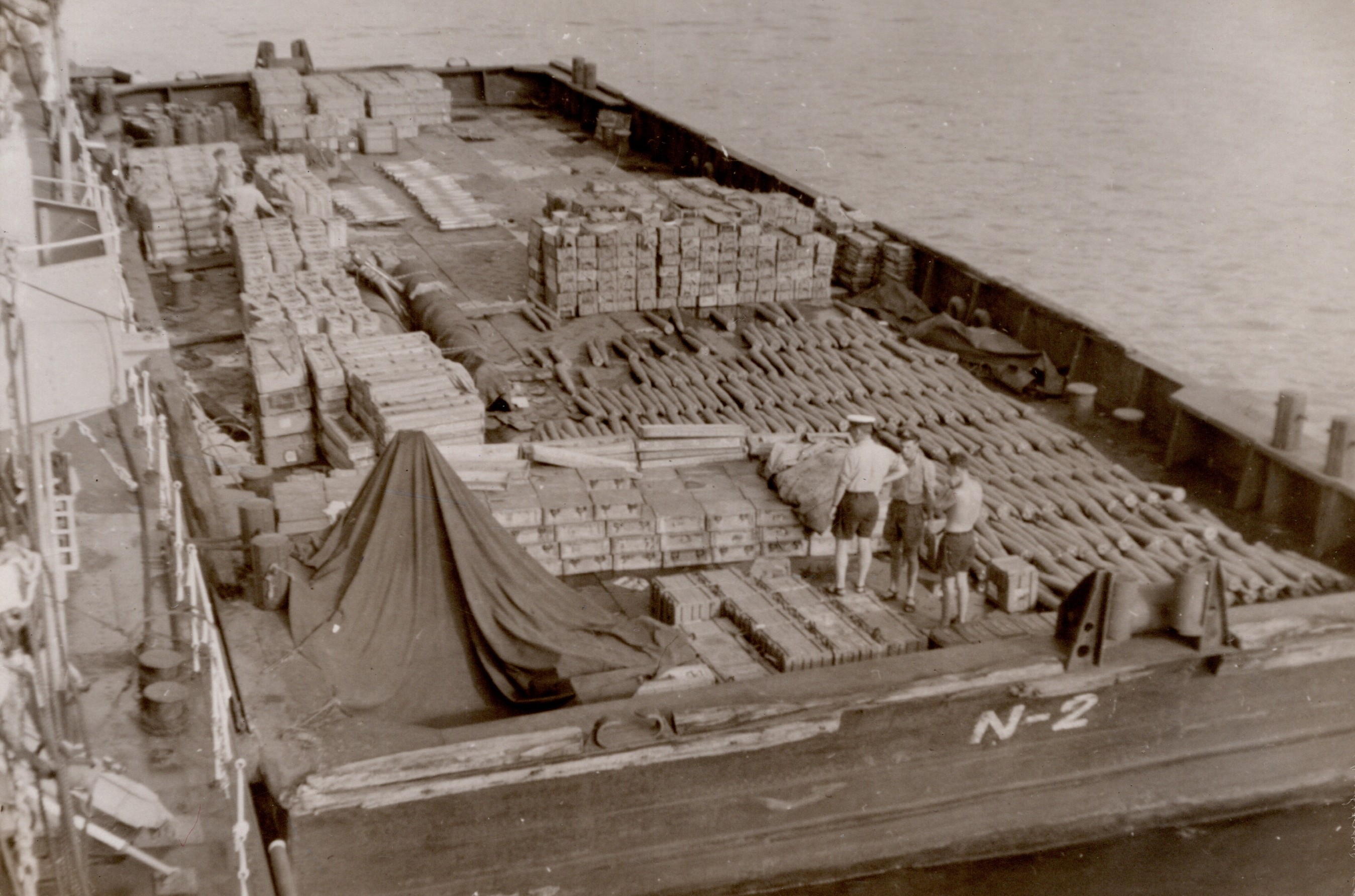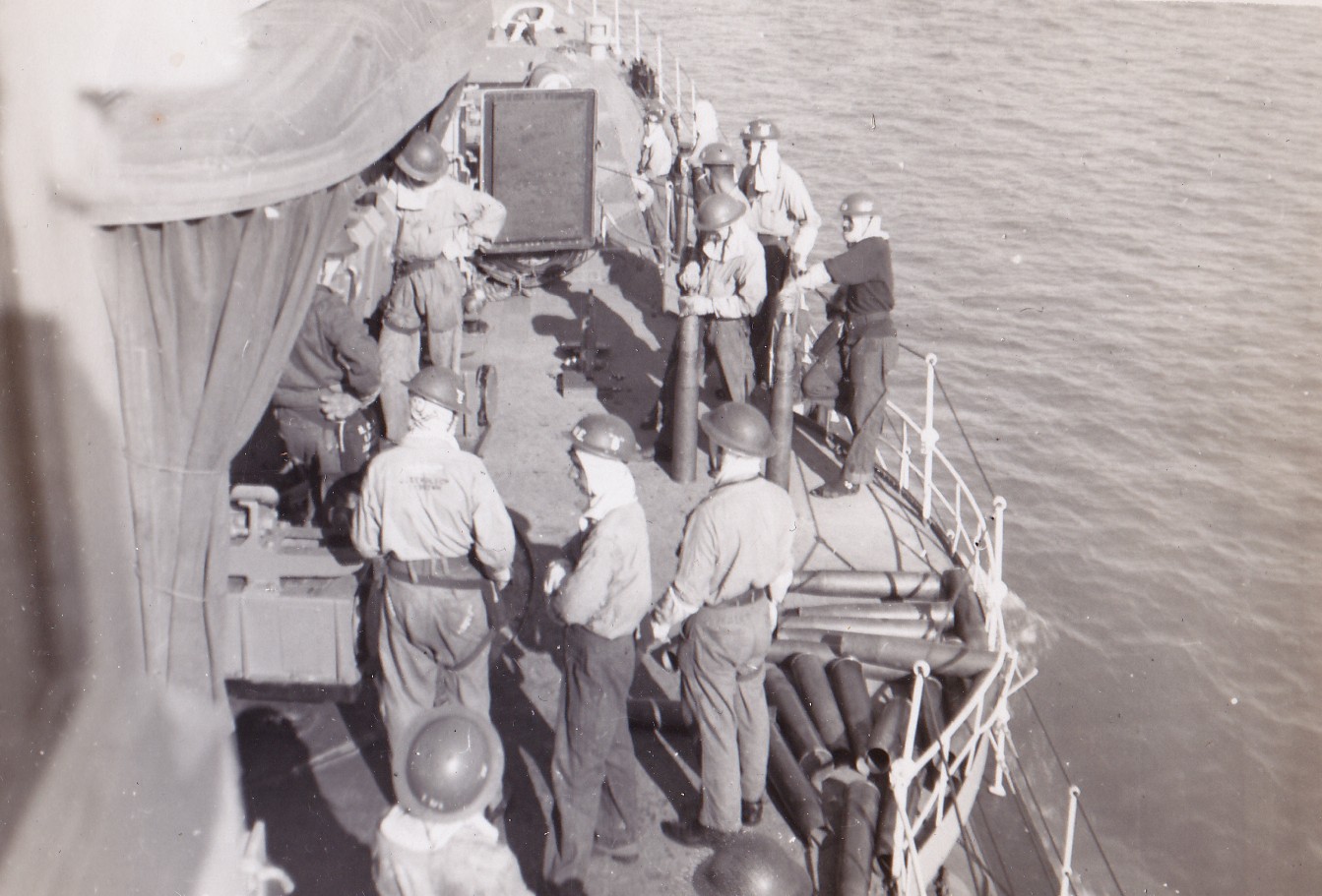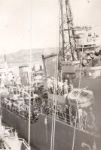 (NRT041) Gun crew on HMCS CAYUGA readying to fire the guns (NRT042) HMCS CAYUGA - after the guns were fired. Note the empty shell casings on the deck (NRT043) Sasebo, Japan (NRT37) HMCS CAYUGA storing ship (NRT044) Ammunition barge at Sasebo, Japan (NRT045) Liberty boat going ashore, Sasebo, Japan, 1950