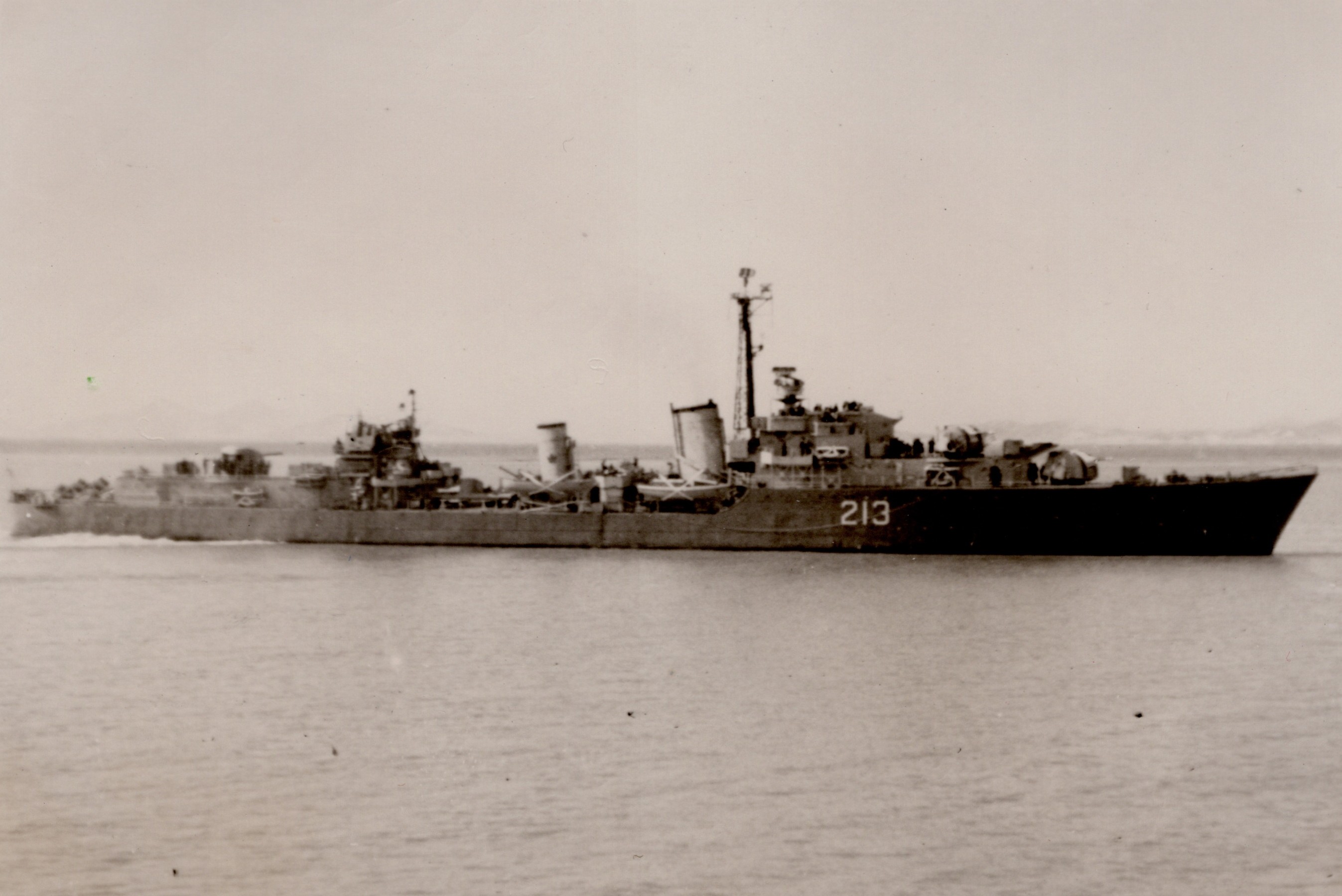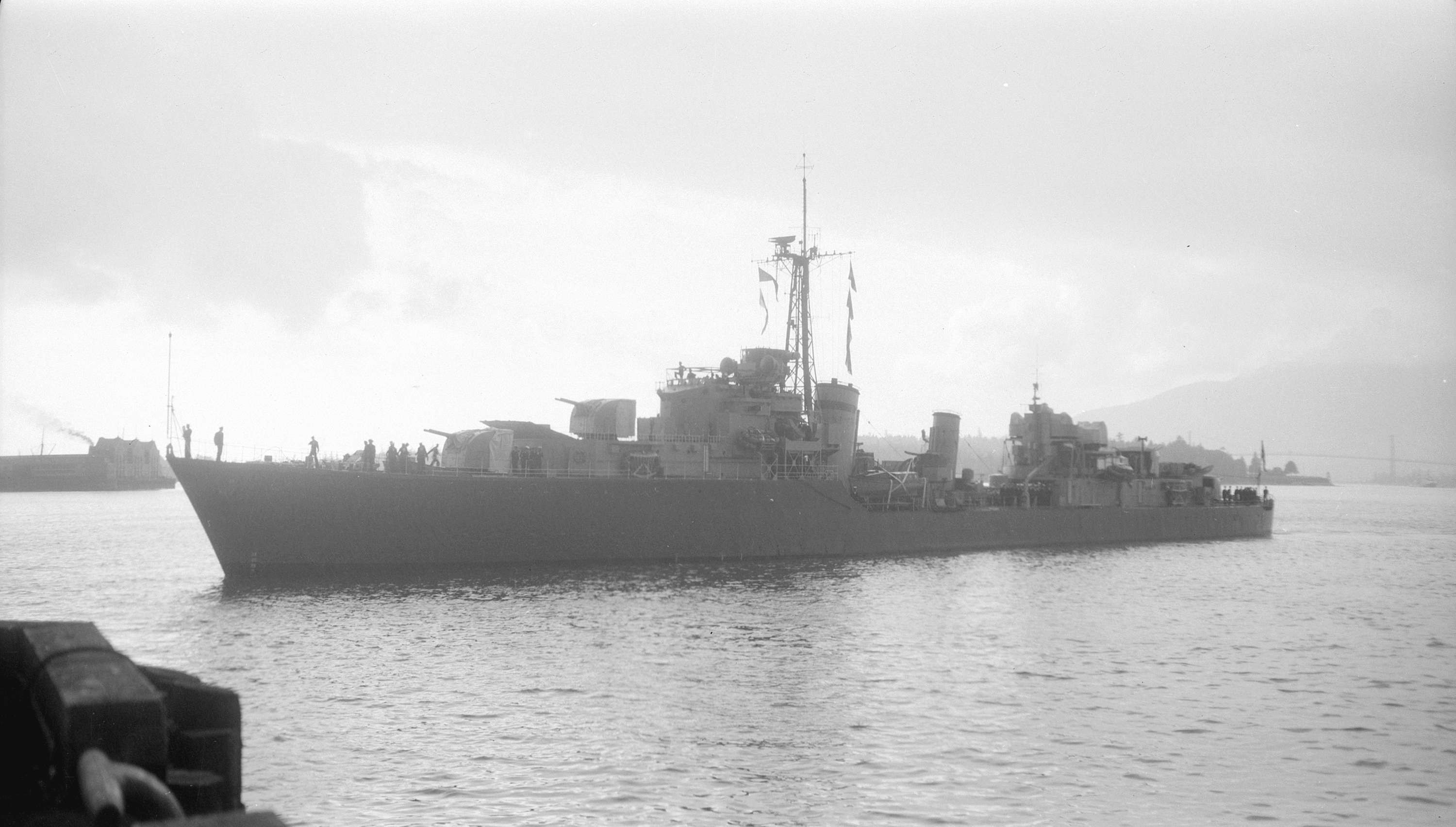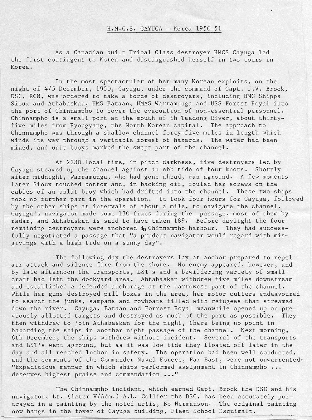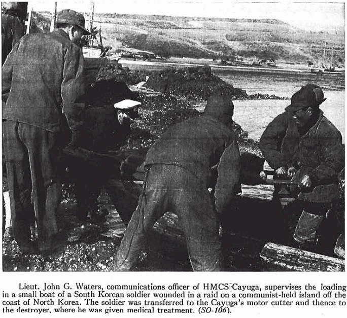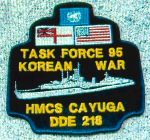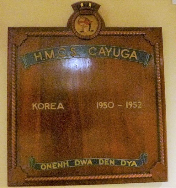On 05 Jul 1950, CAYUGA departed Esquimalt, as Senior Officer's ship of the first three Canadian destroyers to serve in Korean waters. On 04 Dec 1950, a United Nations force including HMCS CAYUGA, HMCS ATHABASKAN and HMCS SIOUX covered the withdrawal at Chinnampho, Korea. During her first tour 1950-51, she went into drydock in Sasebo, Japan - once to have the sonar dome checked and ship painted; and a 2nd time to check the screws for damage as she backed over the ship's whaler. She carried out three tours of duty there, the last in 1954 after the armistice.