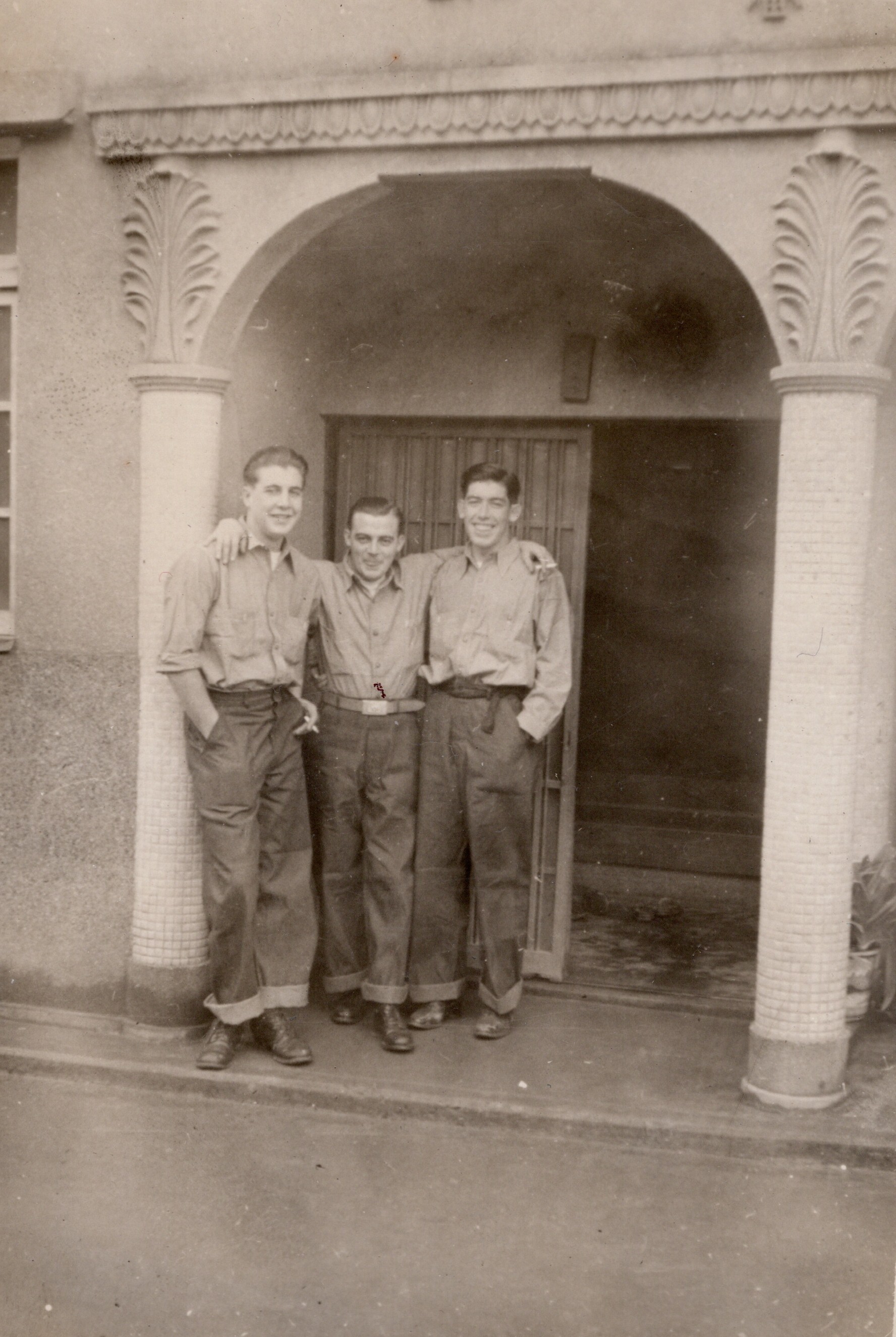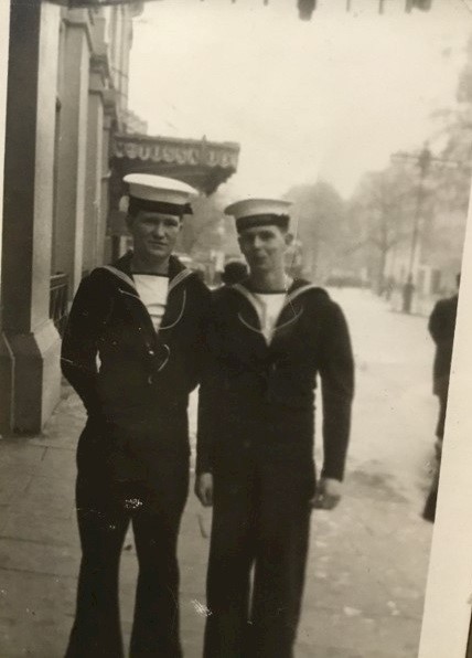 (BJB086) Sailors off HMCS CAYUGA ashore at an unknown location. From the collection of Bernie Bowerbank, LSCV1, RCN Courtesy of Mike Bowerbank